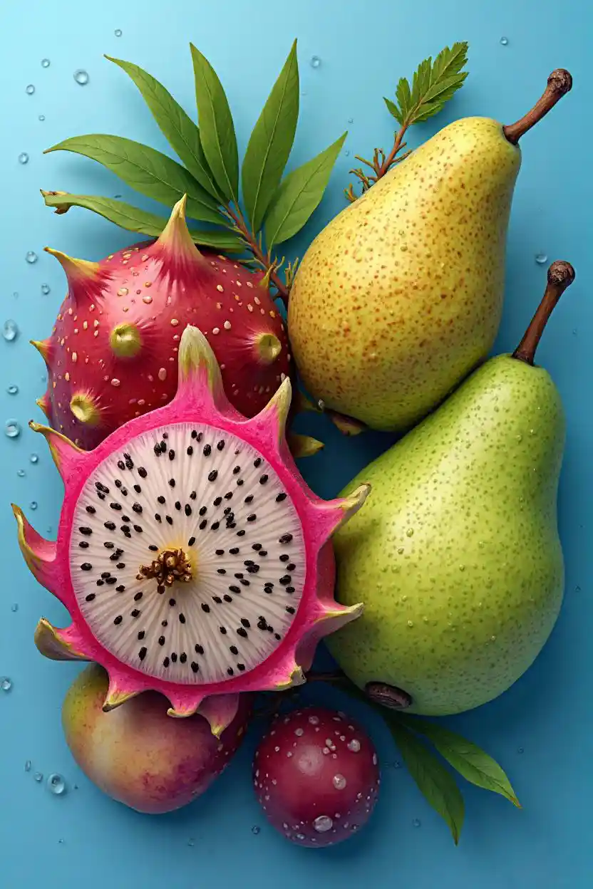 Fotoğraf gerçekçi meyveler çiz, tam olarak olması gereken. Bu meyveler: ejderha meyvesi, kırmızı elma, yeşil armut. arka renkli, taze sulu meyveler, üzerlerinde su damlaları, süper sulu ve lezzetli #qr5stu6vwx