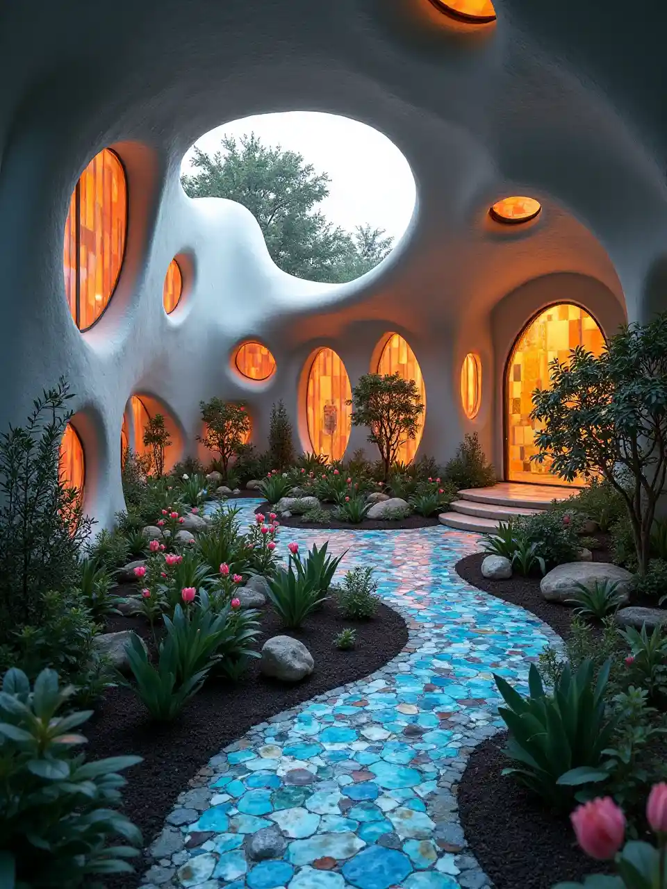 futuristic home, cozy location with amorphic shape with curled path, low cielings, garden under roof many plants and flowers, walls resembles voronoi pattern with round windows made from colorfull stained glass, long mosaic path with curved shape, blue water jets from the cieling, rainbow pallette, high resolution, soft lighting, glowing lamps along the path, contemporary design by Ron Arad, hint of futurism