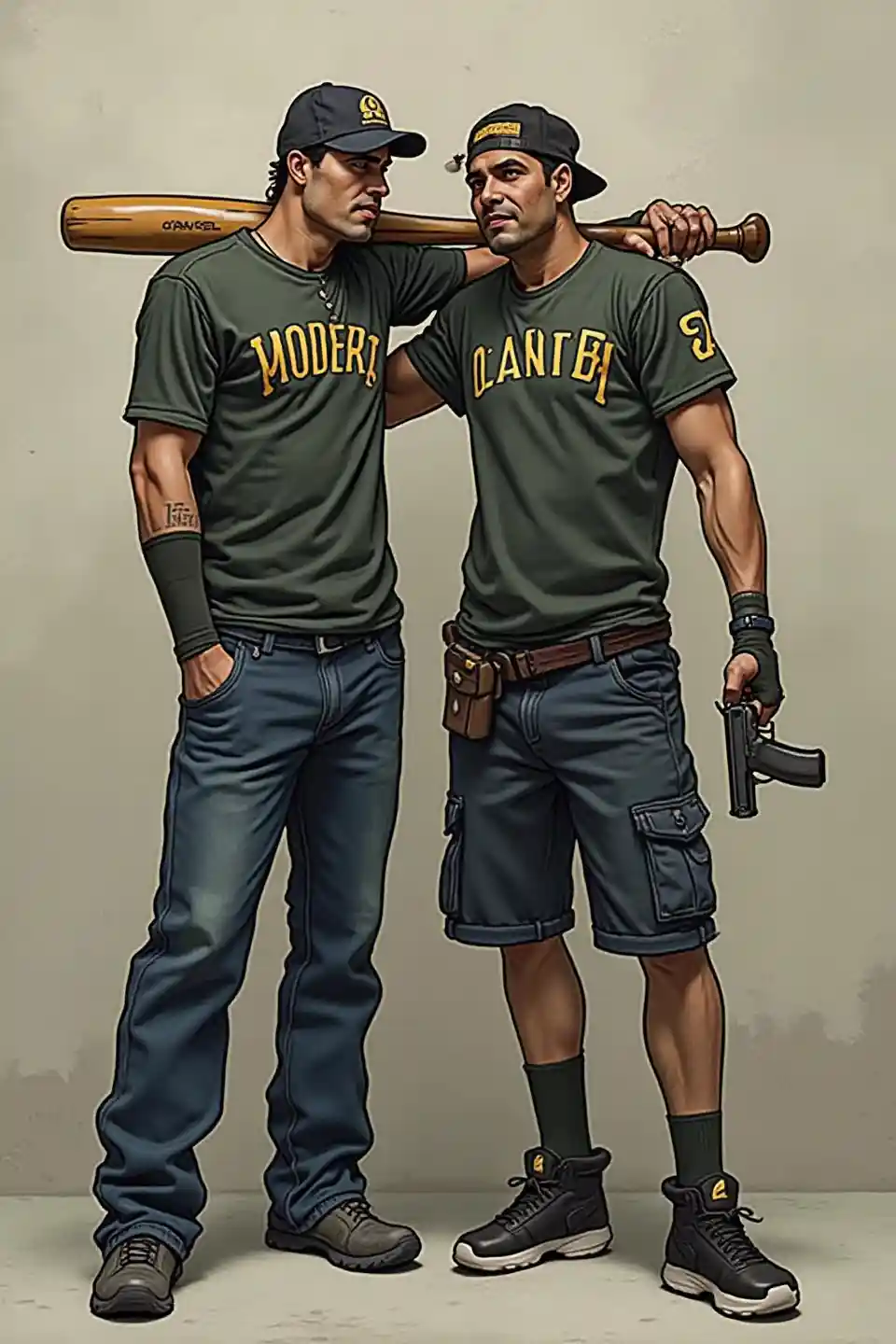 İki adam, İspanyol görünümlü, sokak çetesi üyesi, biri beyzbol sopası (o omzuna atıyor), diğeri ayakta (Beretta 92 silah)