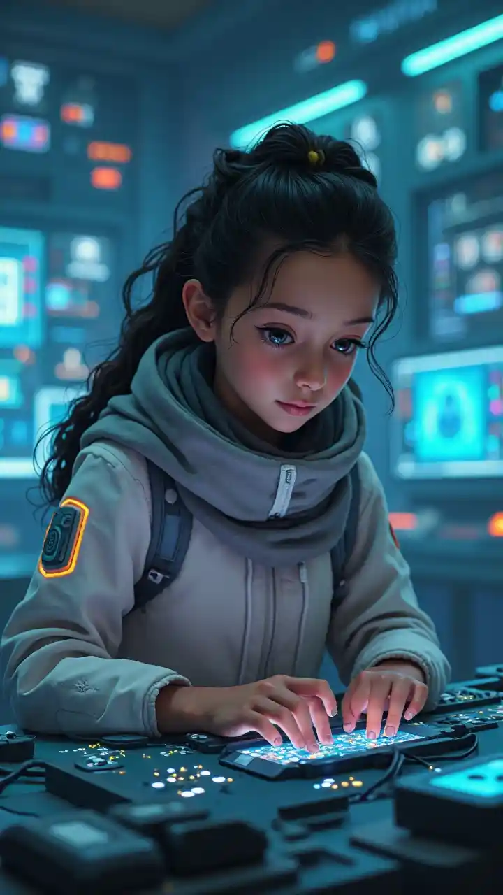 Bir şal takmış 10 yaşındaki Orta Doğu kızı, pixel yamaları olan bir takım elbiseyle gelecekle ilgili bir laboratuarda bir oyun kodluyor. Holografik ekranlar ve gürleyen robotlar onu çerçeve ediyor. Odaklı yazması, yüksek teknoloji, bilimini yansıtan bir alev.