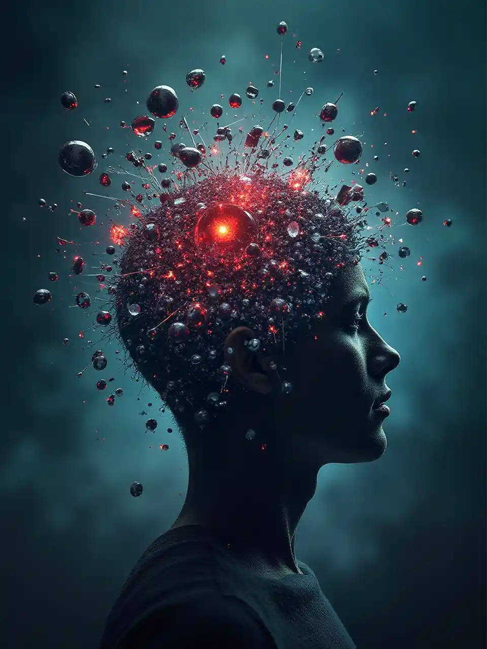 Cam parçalarına ayrılmış bir insan silueti, arkasında statik gürültü ve halüsinasyonlar (üzen saatler, erimiş gözler), sürreal koyu mavi arka, parlak kırmızı nöron sembolleri, saatlerce infografik semboller.