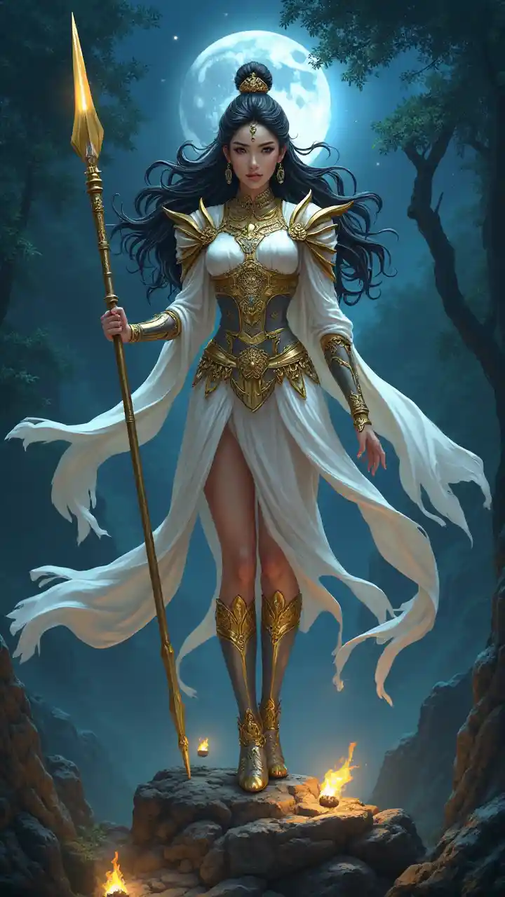 Kadınlığın, savaşın, zekâ ve bilgeliğin tümünü temsil edecek bir tanrıça çiz. Onu Asyalı yap ve gümüş parlak gözlü atletik bir vücuda sahip ol. Zırhını yapmak için obsidiyen ve altın kullan. Ve elbiseleri için beyaz altın kullan. Altın bir mızrak ve gümüş bir kalkan olmalı. Saçları gece gökyüzünden oluşmalı. Yıldızlar ve bulutlar mükemmel siyahlığıyla görülmelidir. Onu canlı ve biraz gerçek dışı yap. Onu geceleri dokunmamış bir doğal ormanda kutsal bir sununun üzerinde yüzen bir resim yap. Parçanın hissi en üst güzelliği, kadın gücü ve ilahilik olmalı. Yarım gerçekçi, hiper detaylı 2 boyutlu konsept sanatı tarzında çiz.