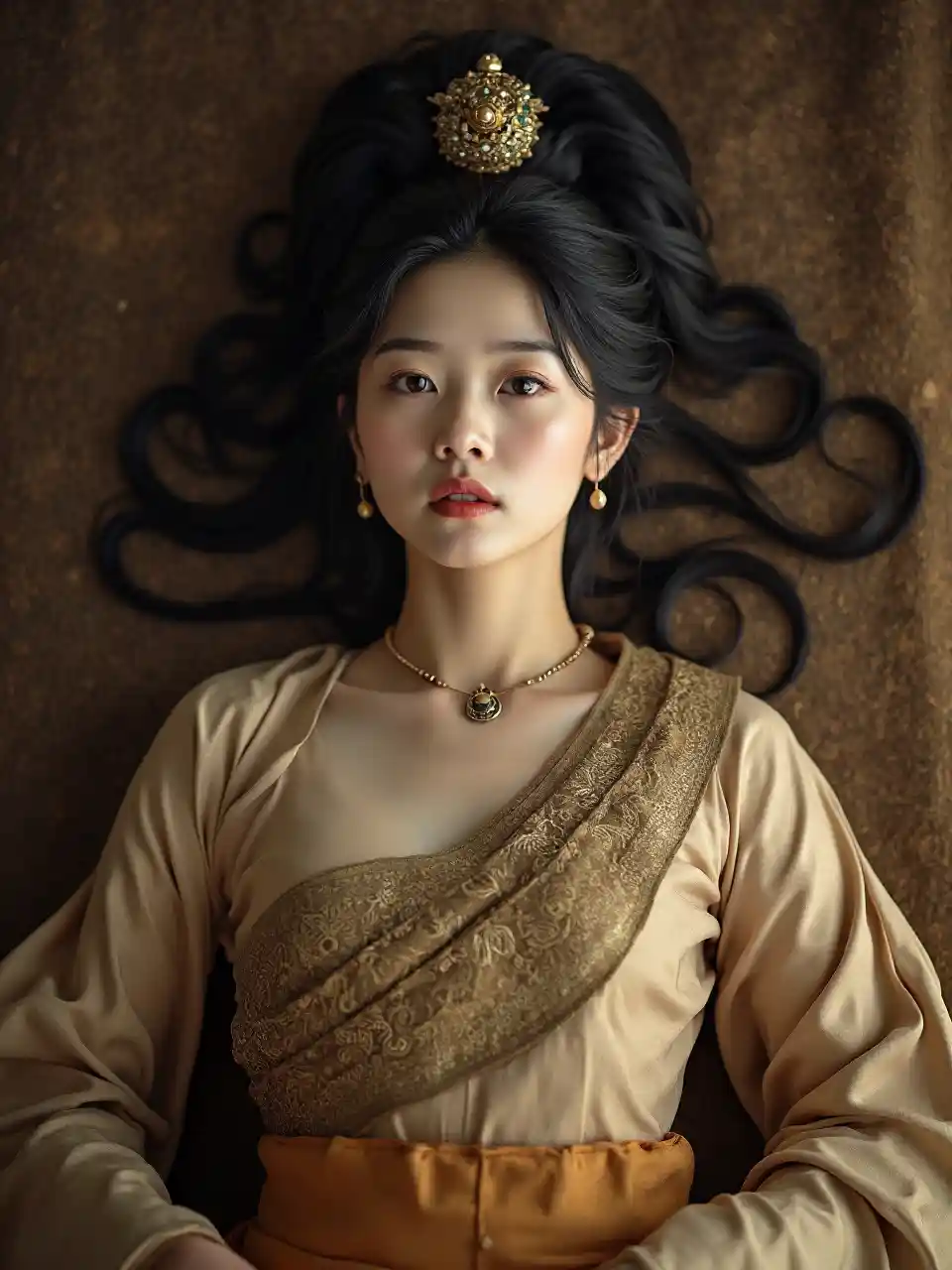 Klasik Song Hanedanlığı Çin'inde yaklaşık 1050 yılında bir futonda uzanan 40 yaşında bir Han cariyesinin yukarıdan bakıldığı bir görüntü. Klasik Song Hanedanı kıyafetleri giyiyor. Saçları Song Hanedanı, gözleri kahverengidir, küçük bir burnu ve dolu bir ağzı var. Song Hanedanı yüz ve vücut mücevherleri giyiyor.