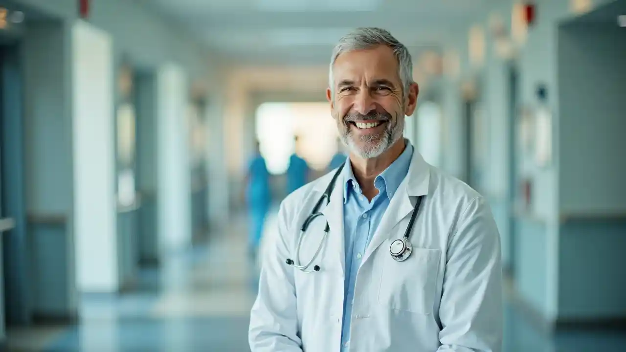 Hastane lobisinde mutlu doktor, parlak gündüz, ultra gerçekçi, keskin odak, detay, 70mm, sinematik, film, gerçekçi, fotoğraf