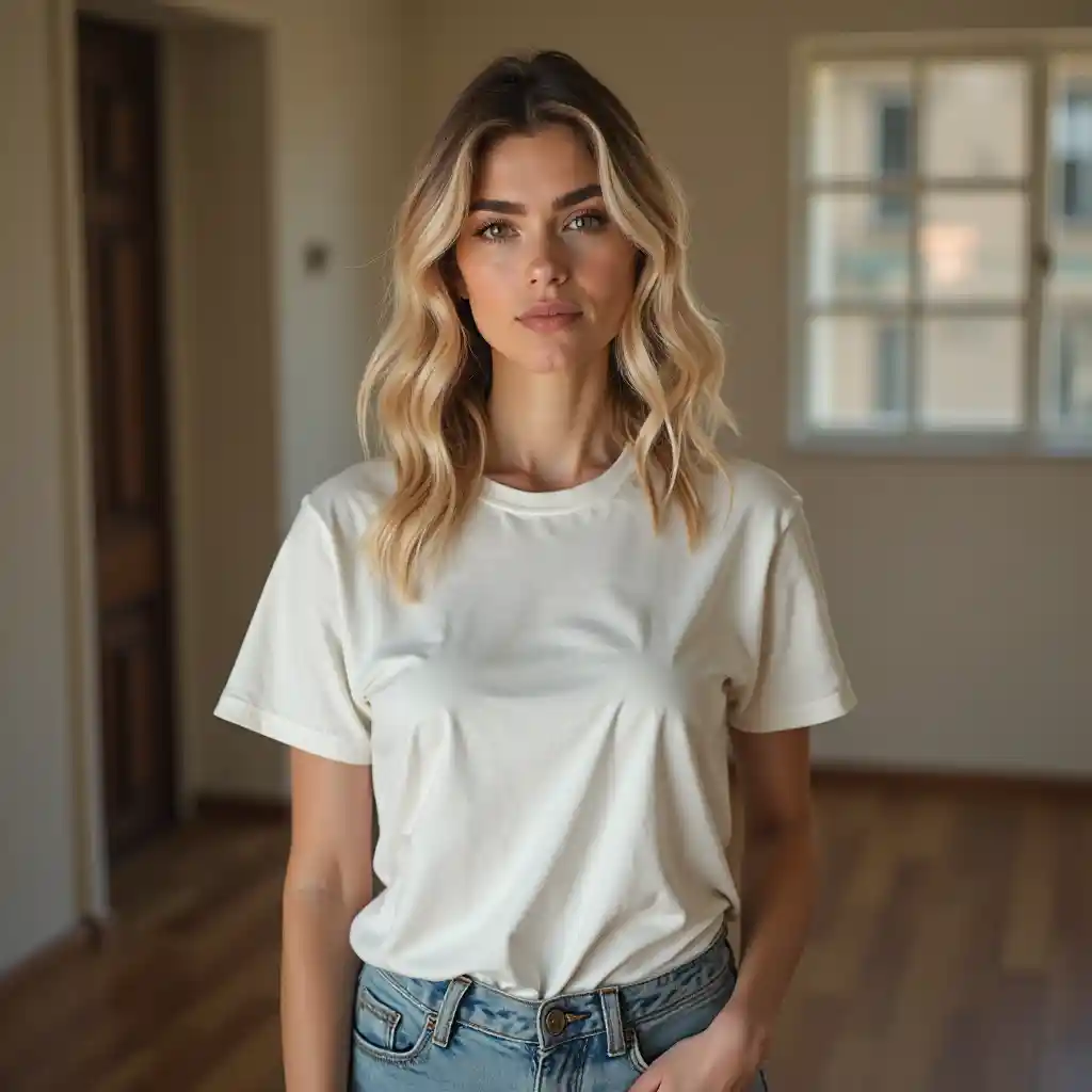 Beni yüksek çözünürlükte yap . 4K . Sarışın bir kadın , Scavandian odasında boş tişört giyerek