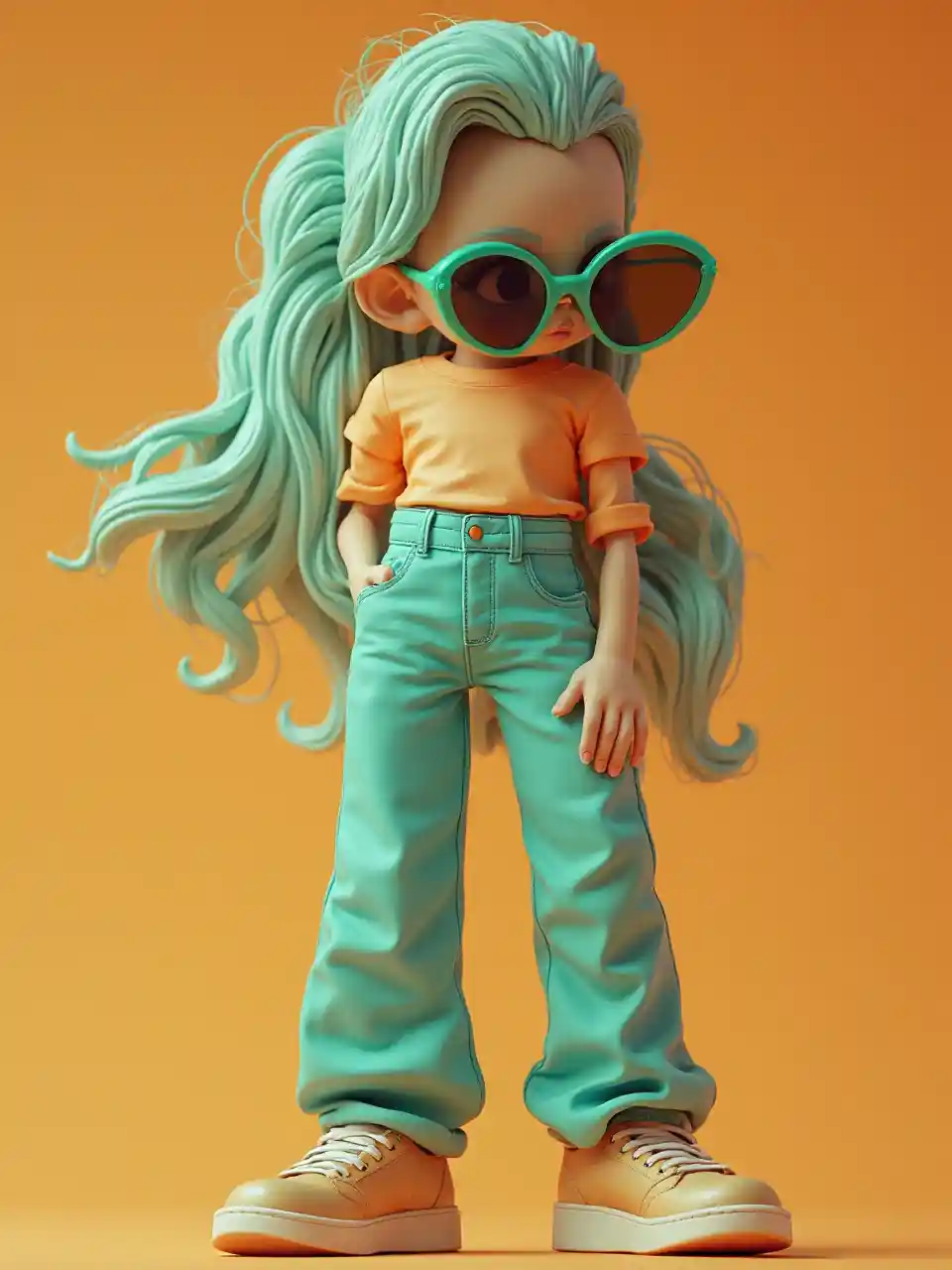 Plastik fantastik tarzı. 3D karakter, hip hop, ace tate güneş gözlüğü, basit büyüklüklü tişört, Ve ayakkabılarla. Vintage cazibe ultramodern estetik elektrik yeşil ateşli turuncu retro diva futurist tuzaklar hacimli saç yansıtıcı yeşil güneş gözlüğü sessiz altın kıyafet efsane makyaj