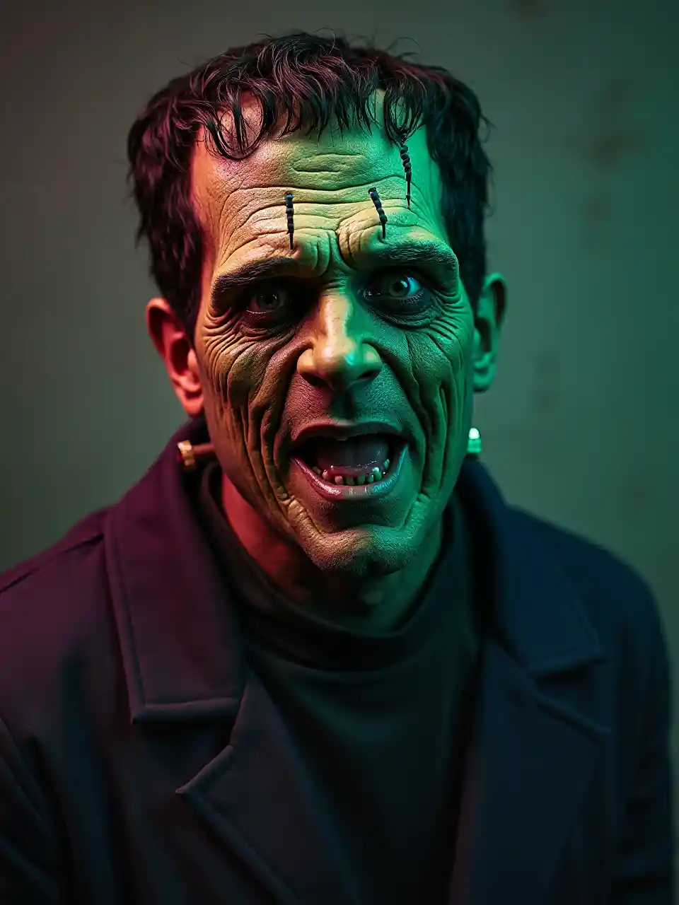 Will Ferrell, korkunç bir kötü Frankenstein karakteri olarak, korkunç Cadılar Günü kostümü, canlı renkler, kontrast renk ürkütücü makyaj cadılar günü kostümü, 1024x1360 boyut oranından esinlenerek