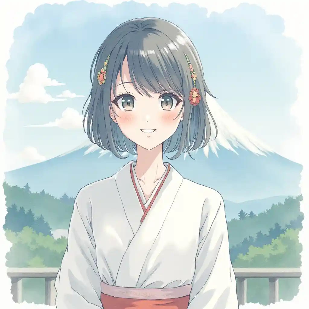 Beyaz kimono giyen tatlı ve gülümseyen bir Japon kız, uzaktan Fuji Dağı. Açık, net, keskin ve sanatsal yüksek çözünürlüklü resim. Nazik su rengi.