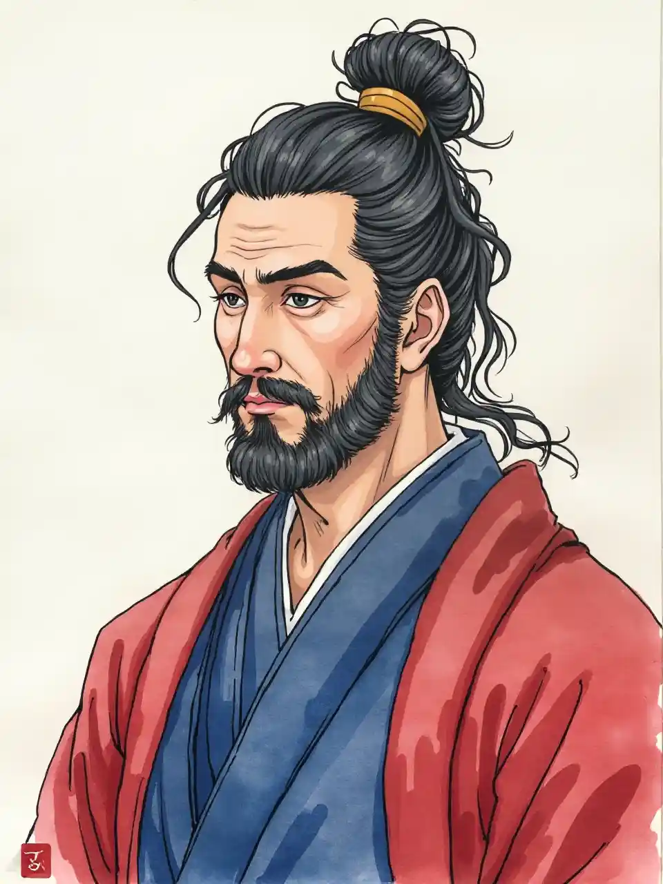 Temiz traş edilmiş orta yaşlı Japon, geleneksel erkek saç kesimi, siyah gri saç, mavi kimono ve kırmızı kumaş pelerini, su rengi resim stili ve