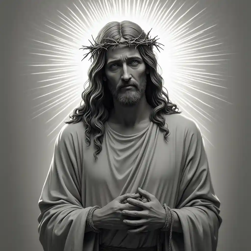 Merkeze, dikenli bir taç ve geniş bir giysiyle süslenmiş sakin ve merhametli bir varlığı temsil eden İsa Mesih'in sakin bir figürü yer alıyor. Uzun dalgalı saçları, hem hikmet hem de iyilik yansıtan bir yüzü ve içi barış dolu gözleriyle özetlenir. Elleri iplerle bağlı ve gözleri çok üzücü. Başının arkasından yayılan ışıl ışıl ışıl ışıl ışıl ışıl ışıl ışıl ışıl ışıl ışıl ışıl ışıl ışıl ışıl ışıl ışıl ışıl ışıl ışıl ışıl ışıl ışıl ışıl ışıl ışıl ışıl ışıl ışıl ışıl ışıl ışıl ışıl ışıl ışıl ışıl ışıl ışıl ışıl ışıl ışıl ışıl ışıl ışıl ışıl ışıl ış Bu müzik, izleyicileri iman ve sevgi hakkında düşünmeye davet ederek saygı ve derin düşünme duygusu uyandırır.