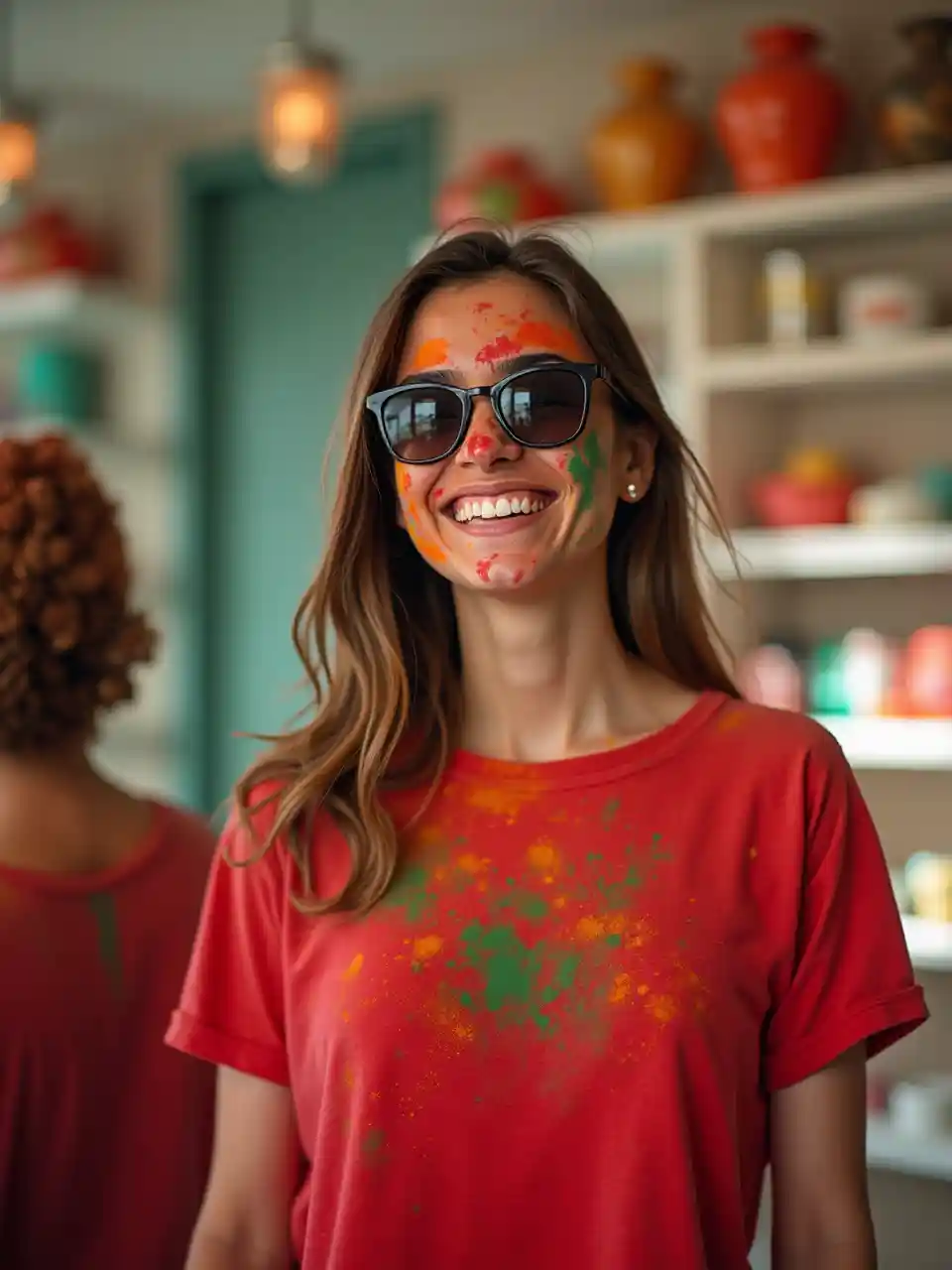 Mutluluk ve canlılık yansıtan genç bir kadın, parlak bir gülümsemeyle, yüzünün kısmen kırmızı ve yeşil tozlarla süslenmiş, muhtemelen Holi gibi bir kutlama sırasında bir bayram atmosferi. Koyu güneş gözlüğü ve tozlu kırmızı bir tişört takıyor. Arkaplan, kutlama toplantısını ima eden raflarla dolu, ışıkla dolu bir iç alanı ortaya çıkar. Ön planda olan kadına odaklanan kompozisyon, sahnenin canlı, cesur estetiklerini artırarak sol tarafta bulanık bir figürle tamamlanmıştır. Genel atmosfer, sıcaklık ve arkadaşlık dolu bir anlatım yaratarak bir sevinç, oyun ve kültürel kutlama duygusu uyandırıyor.