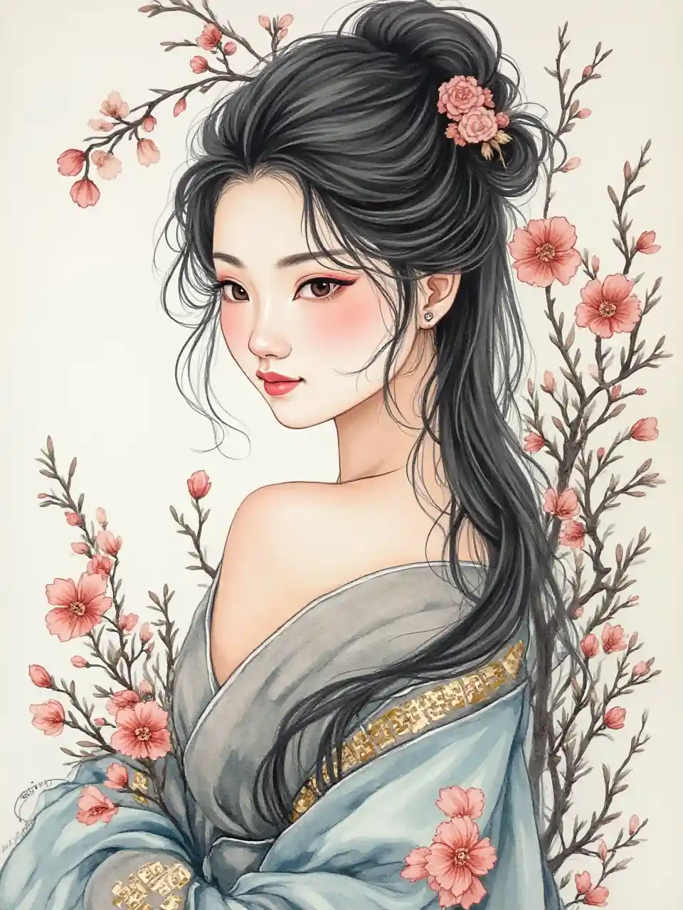 Geleneksel Asya güzellik standartlarını, modern zarafet ve zariflik dokunuşunu temsil eden 25-30 yaşlarındaki bir Koreli kadının mürekkep resmi; yumuşak akışlı çizgiler, karmaşık detaylarla harmanlanarak, kompozyonda ve stilde uyum ve dengeyi yansıtan, yumuşakca soyutlanmış bir doğanın ortasında seren ifadesini ve dengesini yakalar.