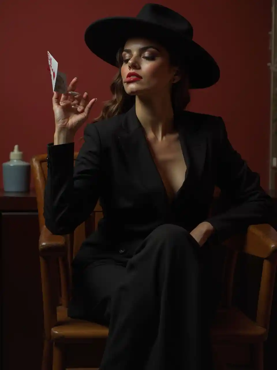 Bir (güzel bir mafya kadını) zarif bir (siyah takım elbise) giyinmiş, (siyah geniş kenarlı şapka) ve (koyu, gevşek pantolon) bacakları çapraz ve zarif bir şekilde bir (ahşap sandalye) üzerinde, oyun kartı oynarken ve sigara içerken. Oda (((bozulan ışık))), (((süslü kırmızı parıltısı)) ile, (gizemli ortam) havasını yayarken, sahne, (eski Hollywood dönemi) ve (ahşap sandalye)) ile, oyuncu ve zarif bir vibe verir.