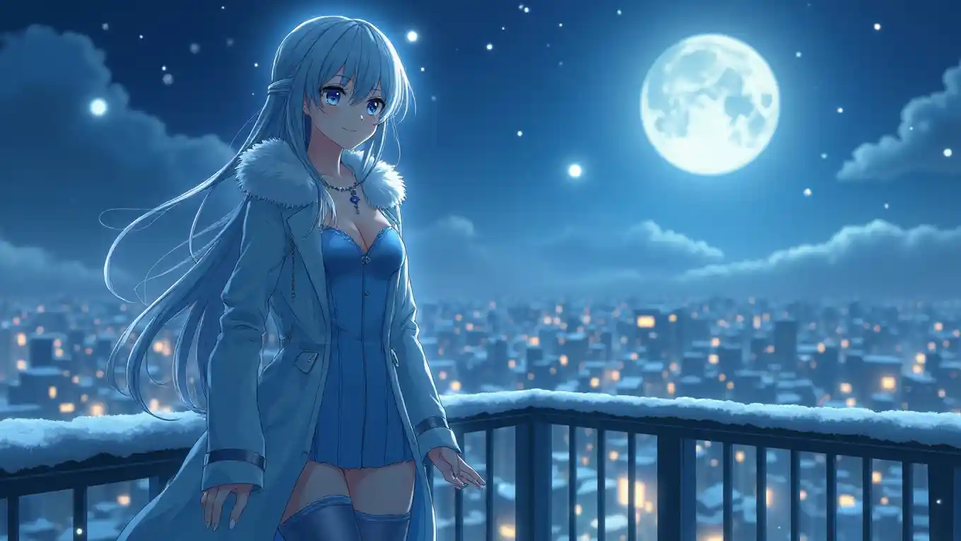 Büyüleyici bir şekilde güzel ve büyülü bir Ultra HD anime kızının yatay büyük ölçekli görüntüsü, dolunay altında parlıyor, açık havada karlı bir çatıda, altta şehir ışıkları varken, sıkı bir elbise üzerinde, derin bir boyun ve kalça yüksekliğinde kürklü bir palto giyiyor, donmuş saçları ve serin bir gülümseme, geniş parıldayan gözleri, parıldayan cilt, buzlu mavi ve gümüş renk paleti, yumuşak özellikleri, kusursuz makyaj, büyülü ve ince bir ışıklandırması, çekici, ince bir dek ile ve uzun, dengeli bir duruşla, mistik ve güzellik ile vurgulamaktadır.