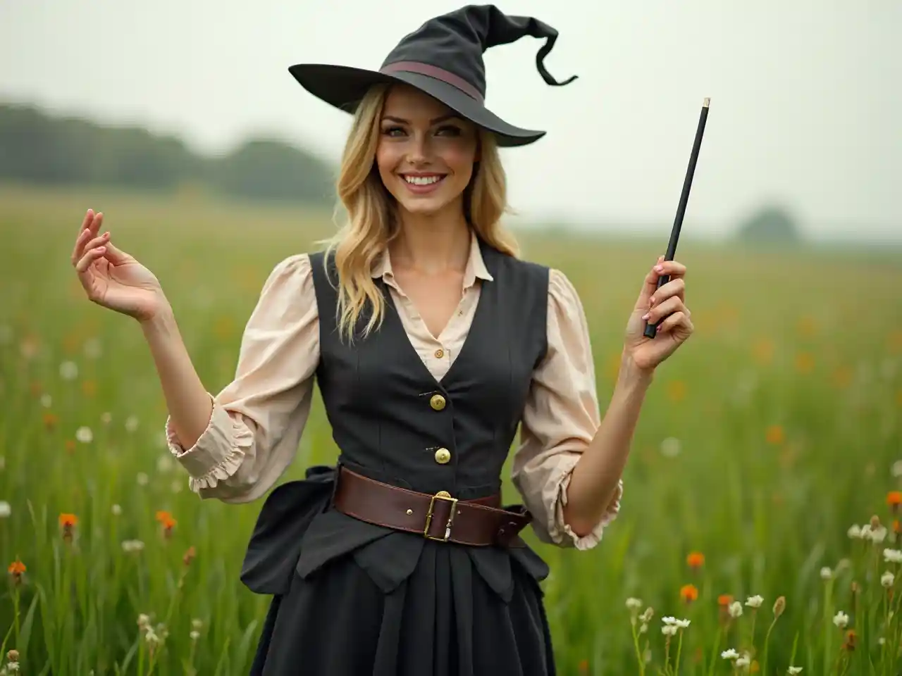 Bir sihirbaz gibi giyinmiş güzel bir kadın gülümsüyor ve bir elinde sihirli bir değnek tutuyor. Diğer eliyle, sihirbaz şapkasını belinin önünde baş aşağı tutuyor.