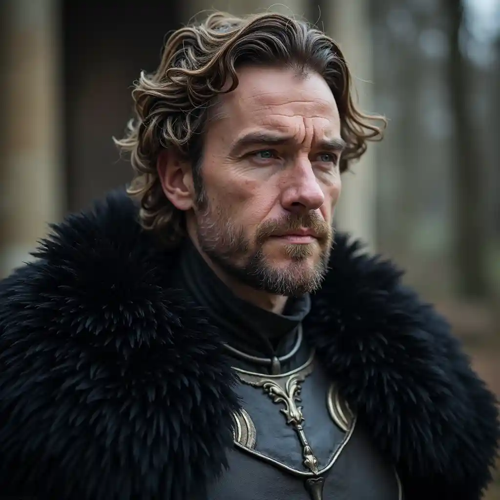 Game of Thrones evreninden 50'li yaşlarda bir ortaçağ adamı kahverengi saçlı, gri gözlü, siyah kürk zırhı giyen