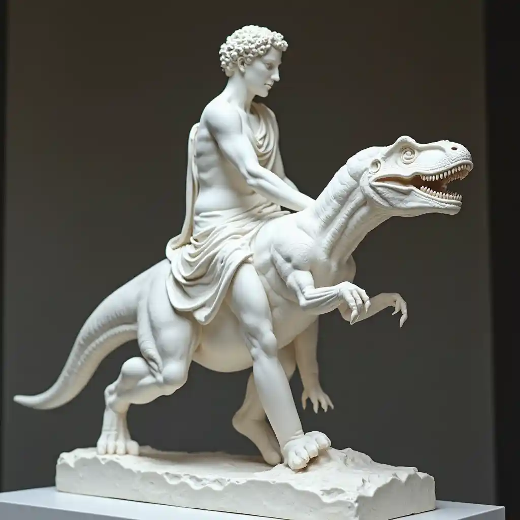 Beyaz Mermer heykel "Vincent van Gogh" bir tiranozavrun üzerinde yüksek kalite, klasik heykel, antik Yunan, ayrıntılı özellikler, beyaz mermer, zarif poz, zarif, yumuşak aydınlatma, geleneksel, tarihi, gerçekçi detaylar, klasik sanat, sakin ifade, gerçekçi, pürüzlü, antik güzellik, klasik, sofistike, geleneksel heykel, zarif, doğal aydınlatma.