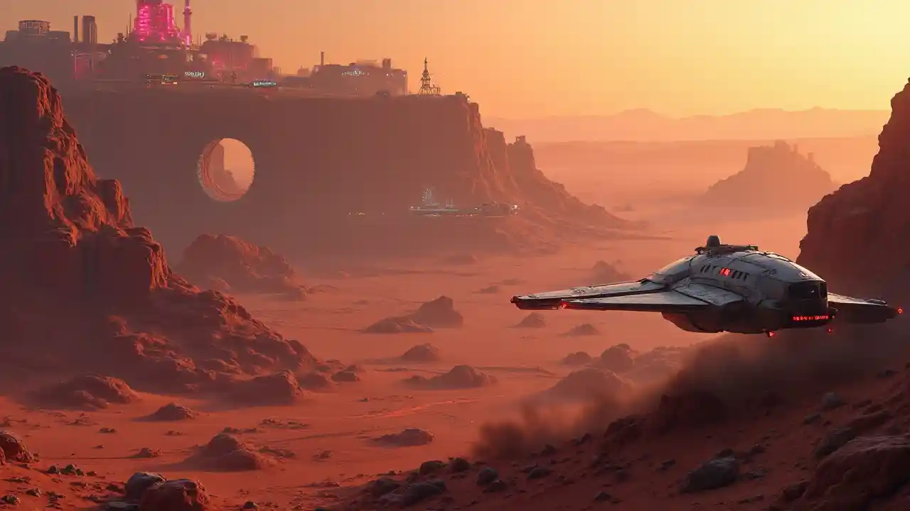 Nefes kesici bir Mars manzarası ve gelecekteki bir koloni . Arkaplanda , ışıklandırılmış endüstriyel yapılar ve bilim araçlarıyla kırmızı kumsalları boyunca geniş bir madencilik operasyonu var . Bir Mars bilim kurgu treni bir dağa kazınmış bir tünele giriyor . Yerin ortasında , neon reklamlarıyla parlayan bilimsel binalarla bir Mars şehri ortaya çıkıyor . Ön planda , yükseklikte , zarif bir bilim kurgu uzay aracı bir platformda iniyor kanatları katlanmış , jet iticileri yükselen toz bulutları . Kırmızı işaretleri . Güneş batışı . Sis.