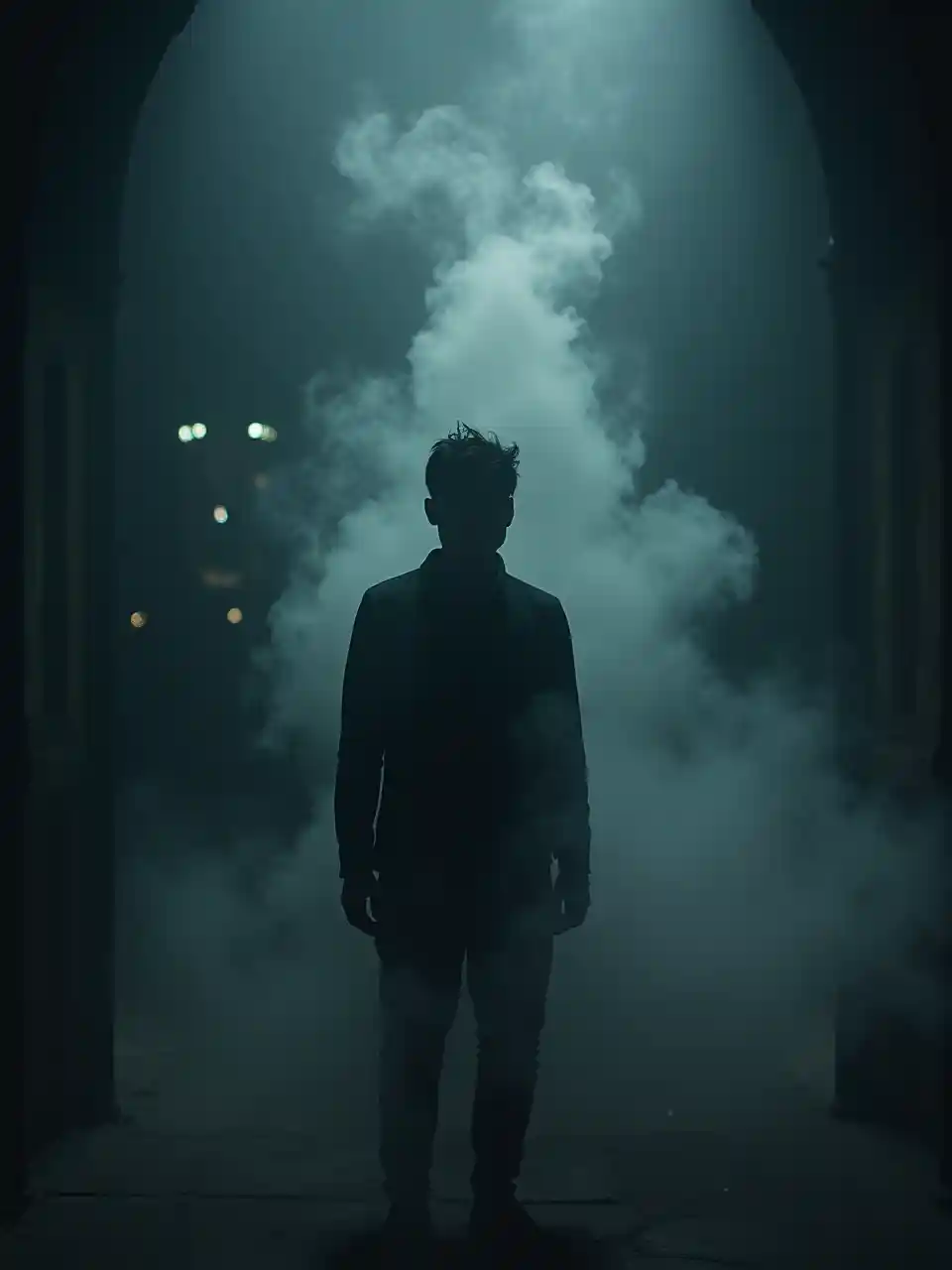Gizemli bir siluet karanlık bir odada duruyor, çevresinde dönen sis ve soluk ışıklar