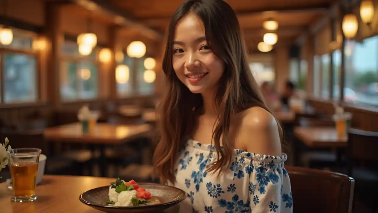 Gece, 21 yaşında, Japon Alman karışık bir kız, 1.85 metre boyunda, 134 kilo ağırlığında, uzun saçlı, düz, kahverengi saçlı, hafif kahverengi gözlü, atletik vücutlu, biraz bronz, beyaz mavi çiçek motifli bir elbise giyiyor, omuzları çok alçak değil, Japon restoranında, mutlu görünüyor, önünde bir suşi var