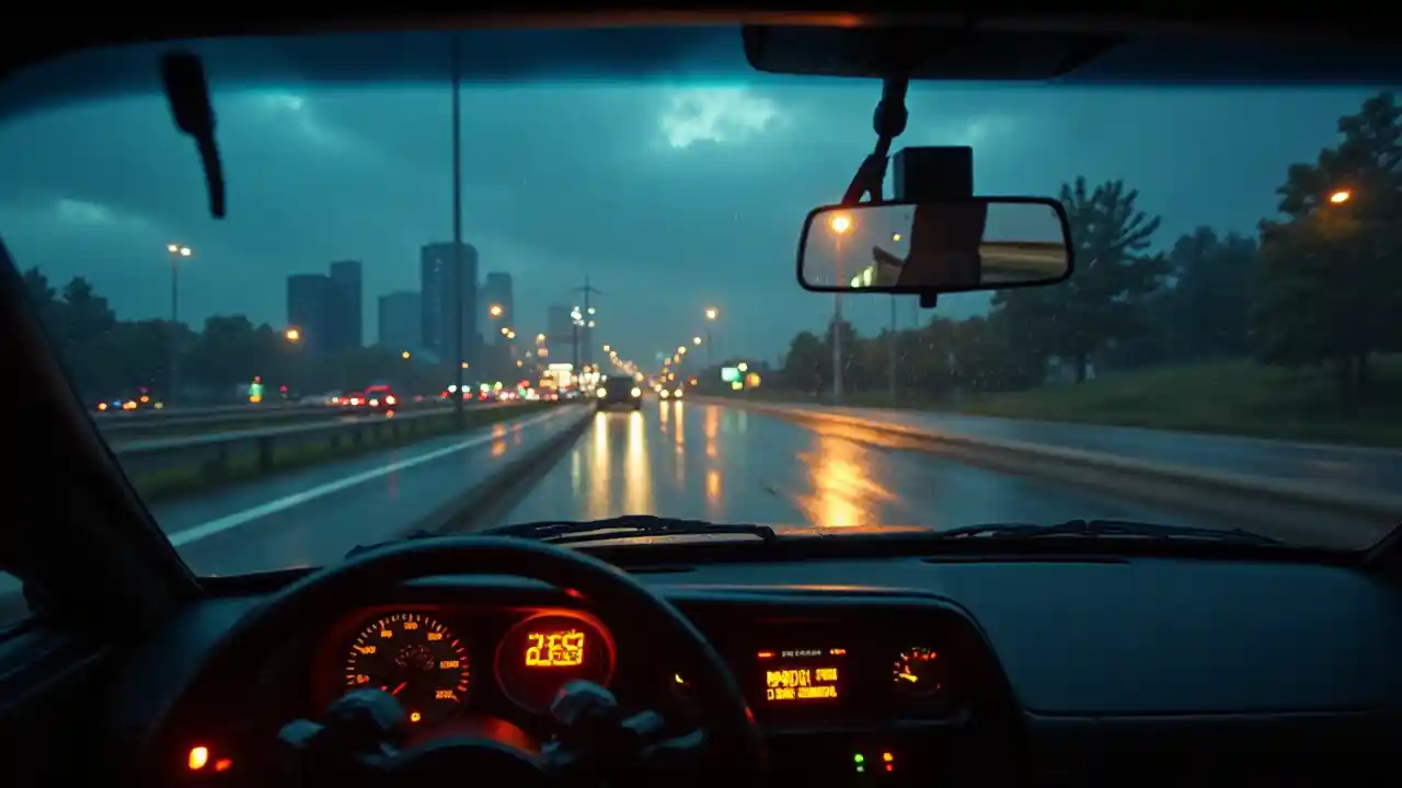 Yağmurlu otoban ortamında sinematik gece sürüşü