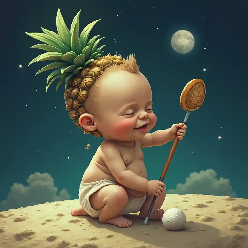 Başında ananasla ayda golf oynayan Down sendromu olan bir bebek yap