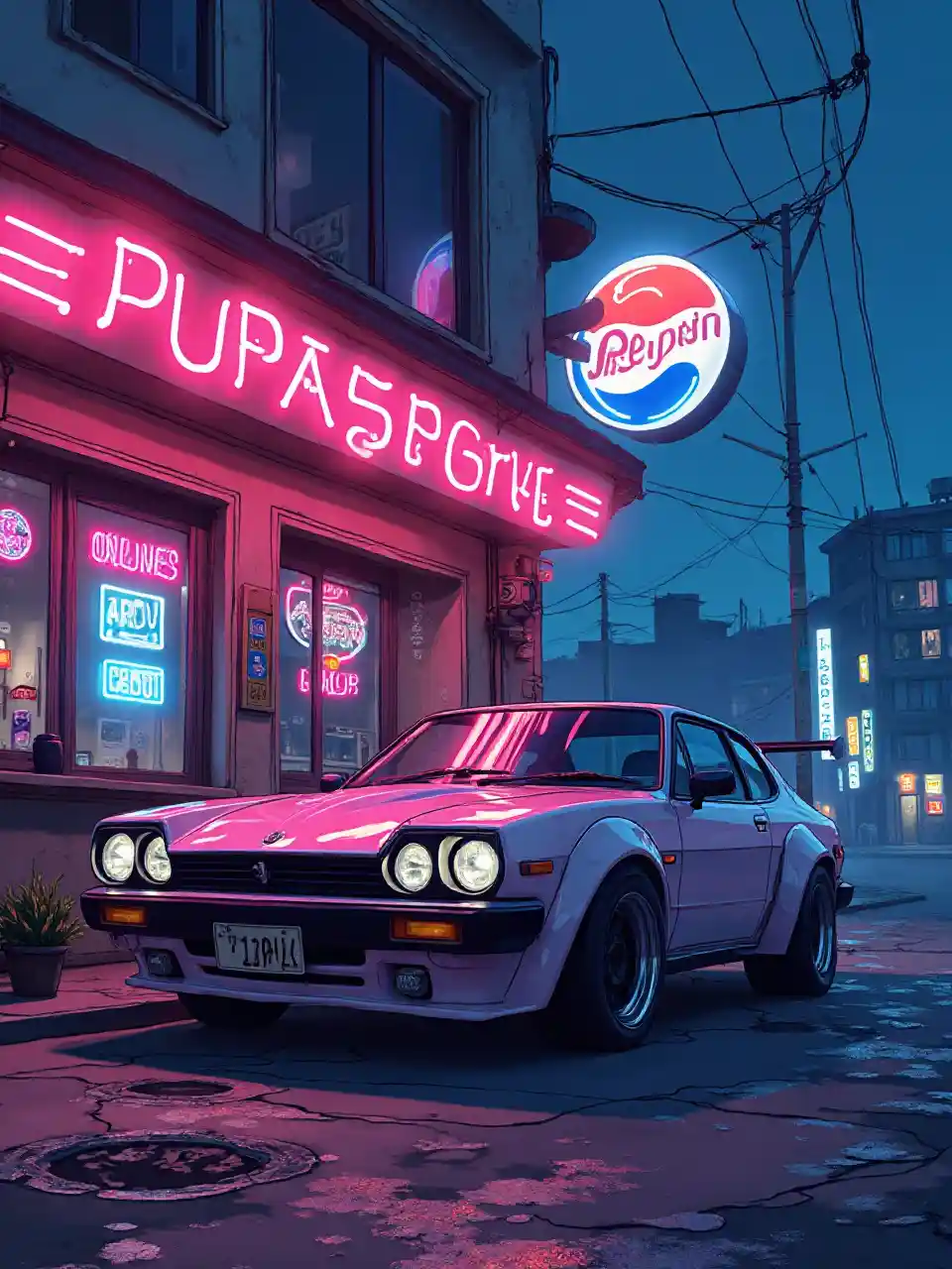 Retro cyberpunk, bir barın önünde park edilmiş Japon arabası, neon ışıkları, anime, pembe ve mavi renkler, Pepsi logo neon ışığı
