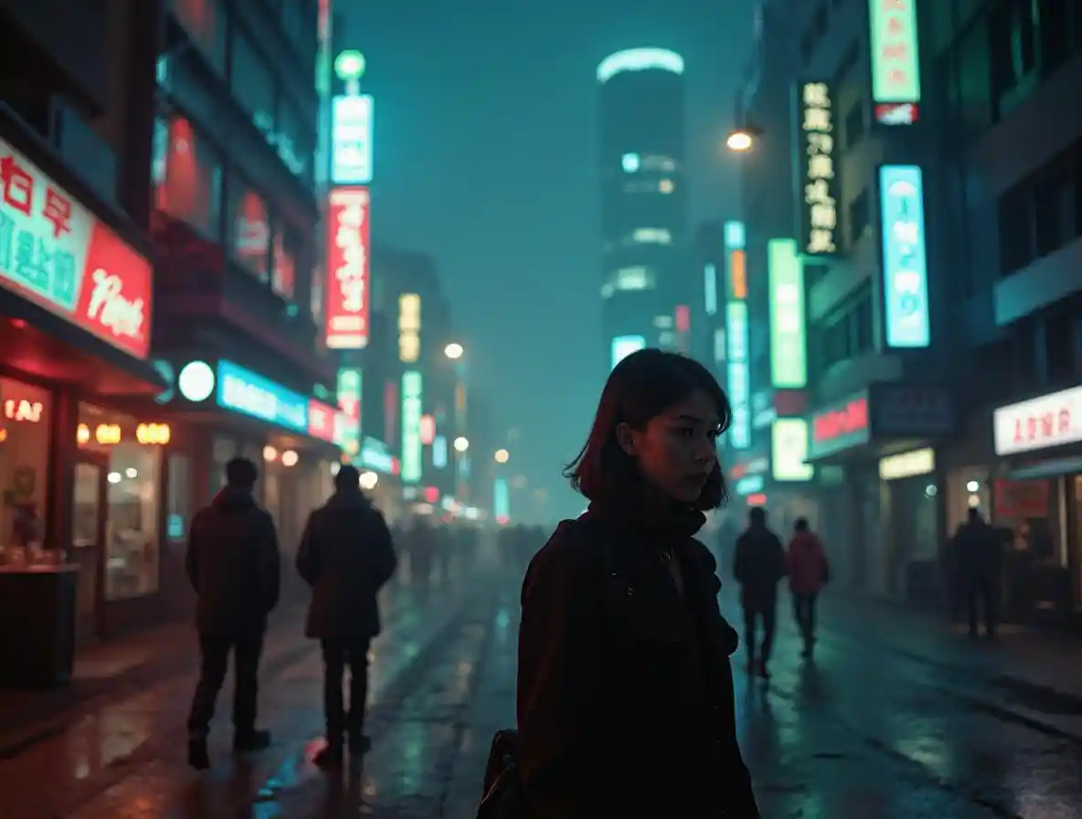 Geceleri vahşi siberpunk şehir manzarası, ultra geniş açılı çekim, parlayan neon işaretleriyle yüksek futurist gökdelenleri, derin perspektif, sisli bir atmosfer. Neon ışıklarını yansıtan ıslak sokaklar, sinematik bir estetik. Ön planda, kameraya bakmadan, yanıp tutuş bir parlaklık ile geçen bir kadın. Yüzü hareket nedeniyle biraz fazla maruz kalmış ve bulanık, ürkütücü ve çarpık bir etki yaratmaktadır. Arkasında, neon ışıklarıyla aydınlatılmış sokaklarda, bazılarının odaklanmamış, kaosa karış hareket eden daha fazla yaya var. Kaza film anlık, dengesiz kompozisyon, güçlü film tanesi, çamurlu doku, Kodak vintage film estetiği, Tokyo ve Hong Kong siber noir sokak fotoğrafı.