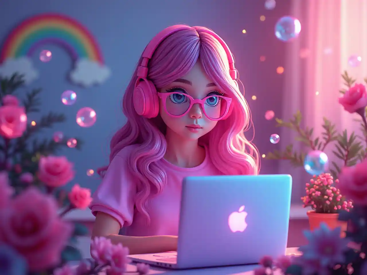 FINNNGözlüklü genç bir kız pembe bir dizüstü bilgisayar, marka olmayan bir fotoğraf, pembe ve mor saç, daha neon tarzı ve arka daha bitki. Balon, tek boynuzlu, gökkuşağı, kulaklığı, mikrofon
