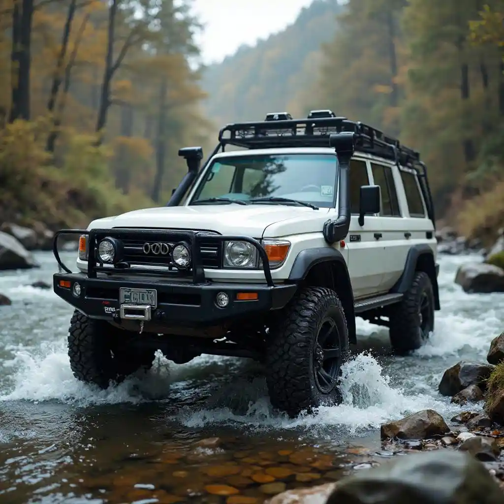 Beyaz bir Toyota Land Cruiser . Şehir ve nehirde