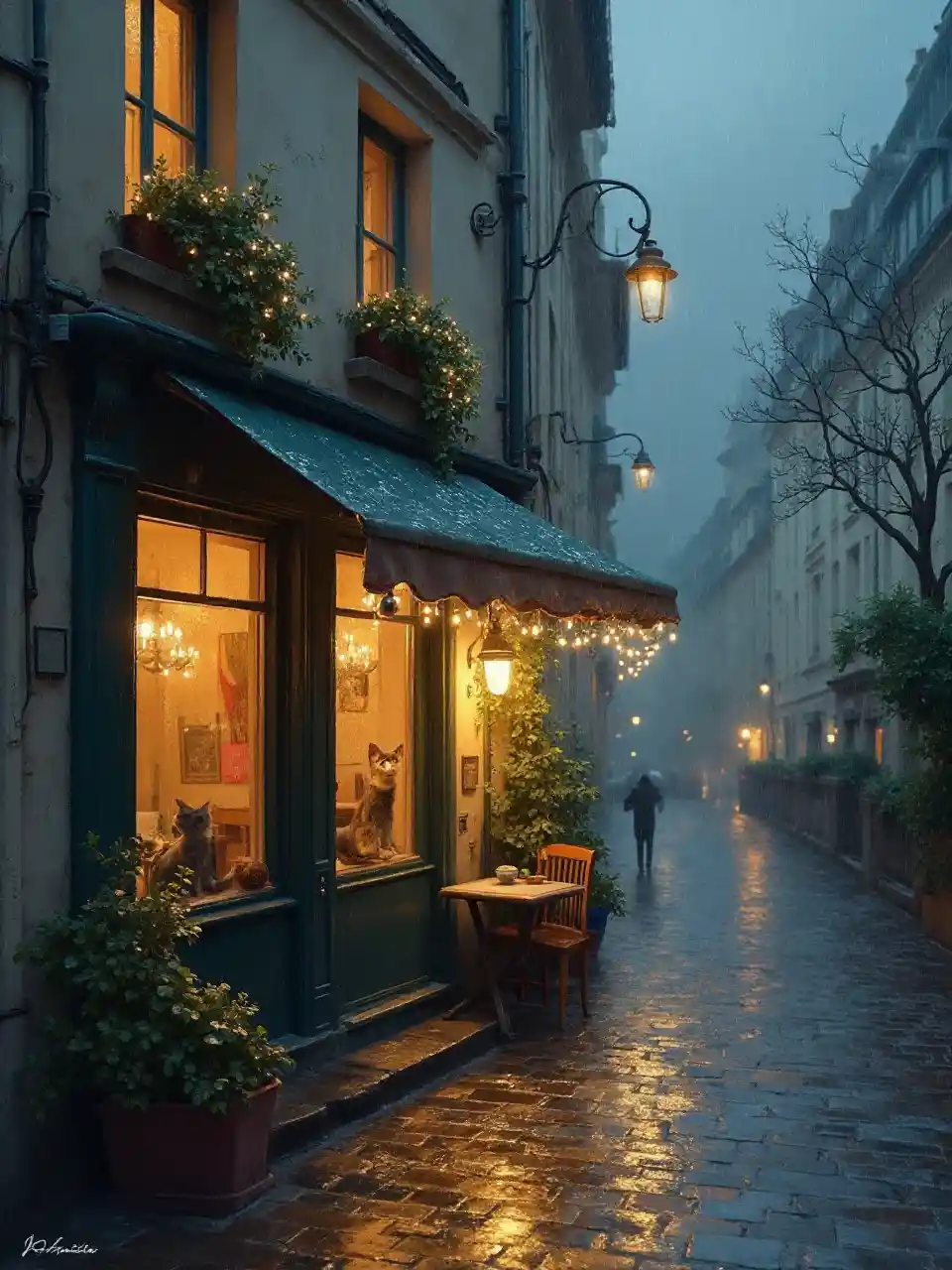 İmpressionist tarzı Paris'teki yağmurlu bir sokak köşesi, perilerin yumuşak ışığında banyo yapıyor. Küçük, davetkar bir kafede taş binaların arasında, pencereleri sisli ve içi sıcak. Yağmur damlaları kaldırımlarında parlıyor ve bir kedi pencereden izliyor, mutlu. Manzara samimi, rahat ve romantik bir akşamı.