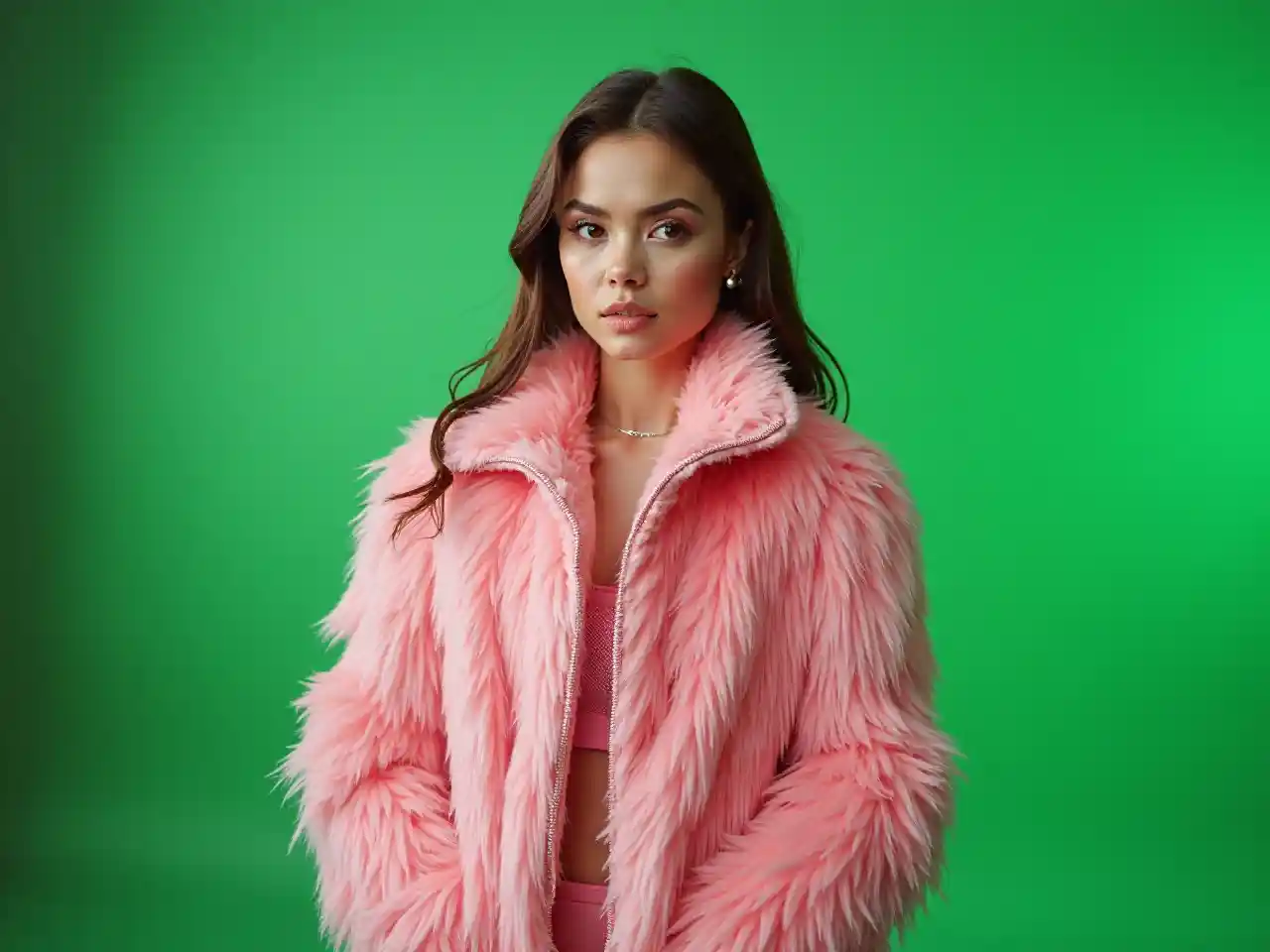 Oliviapembe kürk takımlı bir bebek yeşil bir ekranın önünde poz veriyor. Cesur, grafik çizgiler, hiper-gerçekçi pop, Natalia Rak, Manticore, Michael Page, canlı sahne arka, Kodak Plus-X