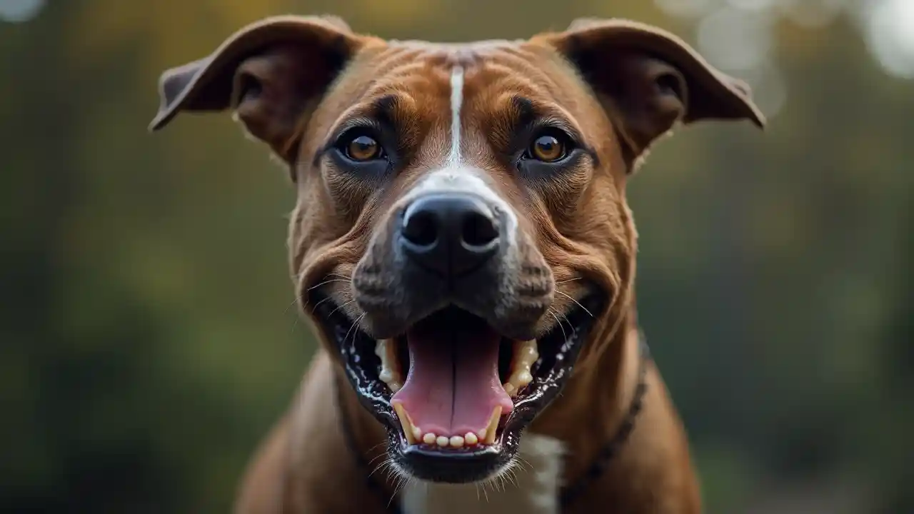 PaisleyÇok agresif bir pitbullun kafası dişleri ve sızıntıları, düz görüş