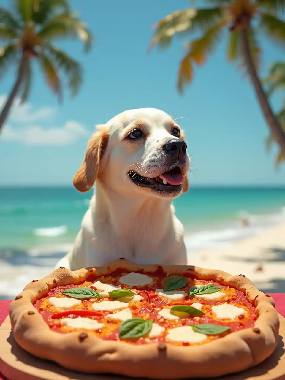 Köpek, deniz kenarında, palmiye ağaçlarıyla karışık bir pizza ile →