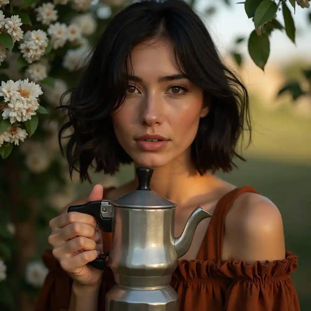 Eski bir kahve tenceresi tutan güzel bir İranlı kadın, yüzünde beyaz çiçek yapraklarından güneş ışığıyla. Fotoğrafçı Mika Aero tarafından çekildi ve sinematik bir his taşıyor. Bu bir portre çekimi. Kahverengi giyiyor . Saçları kısa, düz, siyah saçlara dönüyor. Gözlerinin yakın çekimi, odak, yüksek çözünürlük, doğal ışık, keskinlik, bokeh etkisi, alan derinliği, ince detaylar, yüksek kalite, Fujifilm kadife tarzı.