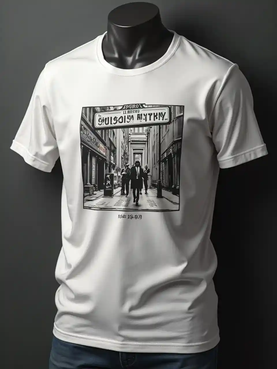 "Bir logo ile premium ağırlıklı erkek tişörtünün fotorealistik bir görüntüsü oluşturun. Tişört, dokusunu ve ağırlığını gösteren yüksek kaliteli, gerçekçi bir ortamda tasvir edilmelidir. [New York şehri işaretinin siyah beyaz bir resmi üzerine sir benni miles, Benjamin Marra, uluslararası tipografik stil, logo, karakter portresi] olarak belirtilen logo, göğüs alanında belirgin bir şekilde gösterilmelidir. Görüntü kumaşın kalitesini, ince dikişleri ve tişörtün genel lüks hissini vurmalıdır. Işıklandırmanın ve gölgelerin gerçekçiliği arttırdığından, tişört mümkün olduğunca dokunmaca görünür.