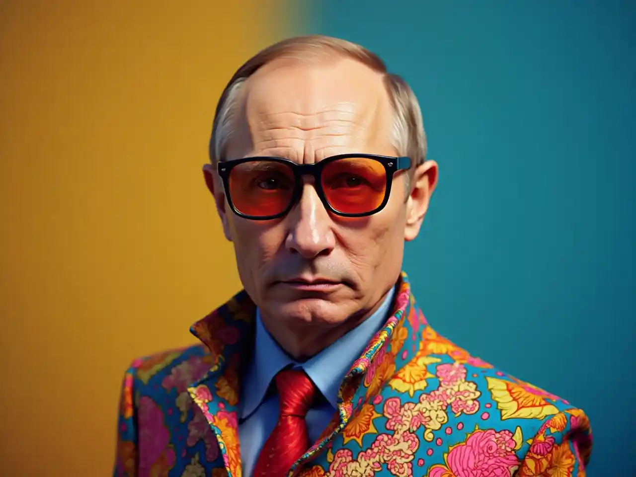 Vladimir Putin parlak desenli bir ceket ve yolcu gözlüğü giyiyor