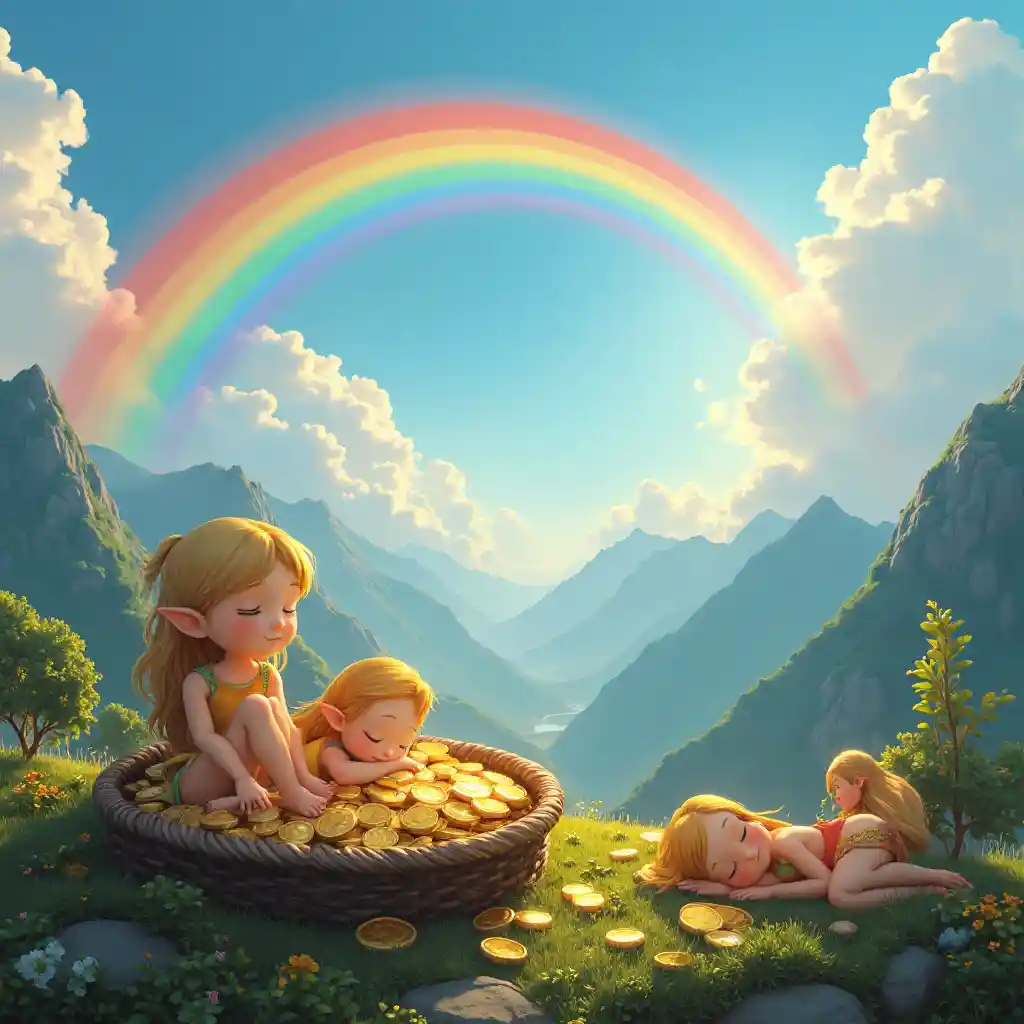 Parlak mavi gökyüzünde, yeşil bir vadinin etrafındaki uzak dağ zirvelerinin üzerinde hareket eden yumuşak, hafif bulutlarla boyanmış, canlı bir gökkuşağı zarifçe yayılır. Gökkuşağının sonunda, açık bir sepette parıldayan bir yığın altın sıcak, davet edici bir parıltı. Yakınlarda, sakin, huzurlu ifadeleri olan üç hassas elf kız, köpüklü lekelerde uyuyor, bulutların içinden yumuşak ışık filtresi, fotorealistik detay.