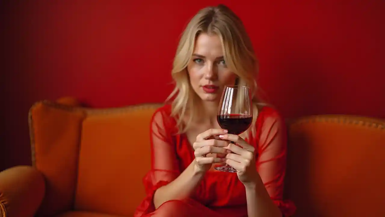 50 mm fotoğraf, camdaki kırmızı şiraz, kırmızı arka plan, sert gölgeler, camı tutan güzel 25 yaşındaki sarışın kadın, kırmızı, pastel renkler giyiyor, turuncu bir divane oturuyor