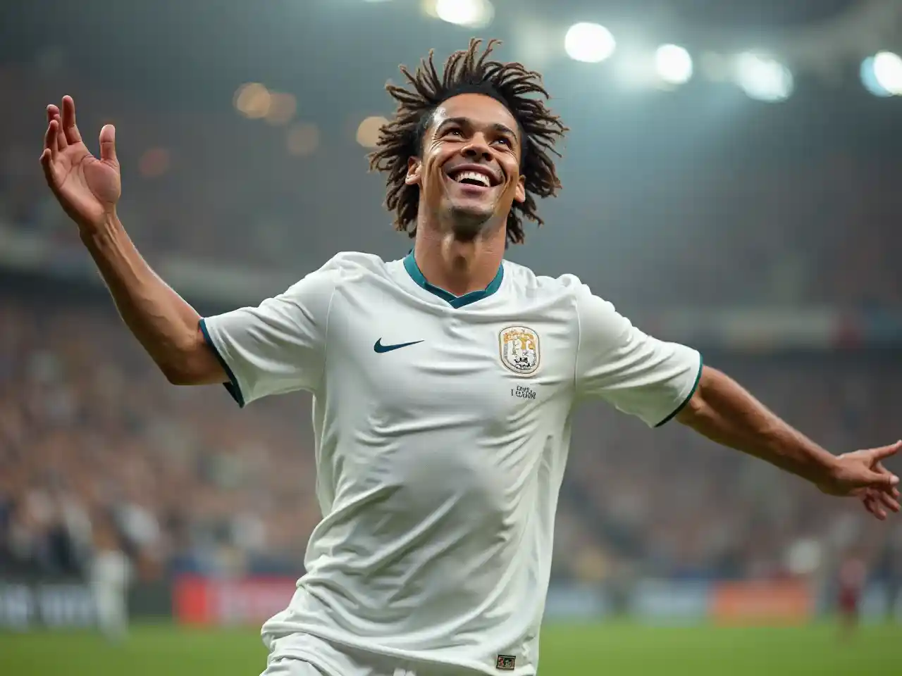 MatthewRonaldo beyaz gömlekle futbol oynuyor, gülümsüyor, ellerini havaya uzatıyor, Americo Makk, plastikçi, foto-realist, renkli bir fotoğraf