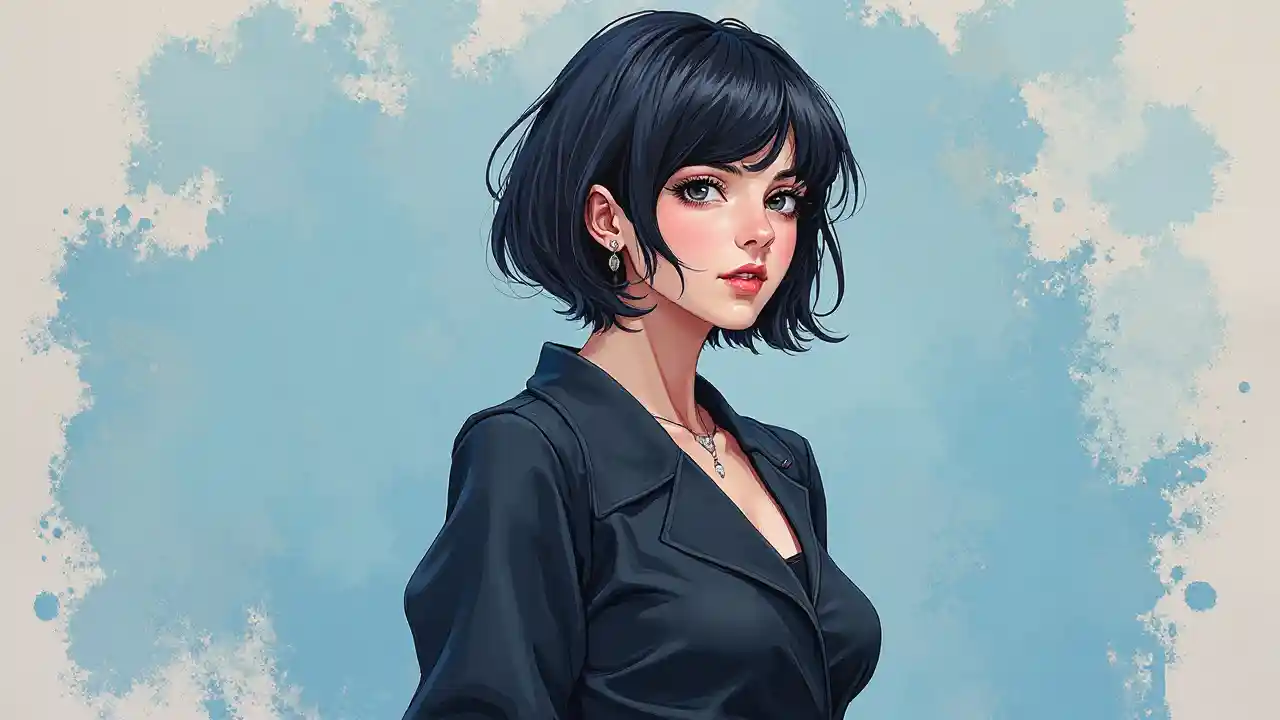 Kız, Kısa saçlı, sosyal medya portresinde, yakışıklı, sevimli, güzel vücutlu, sık, sakura miko kıyafetleri, Siyah kıyafetleri, Siyah ve mavi, illüstrasyon, Amerikan çizgileri, akrilik resimleri