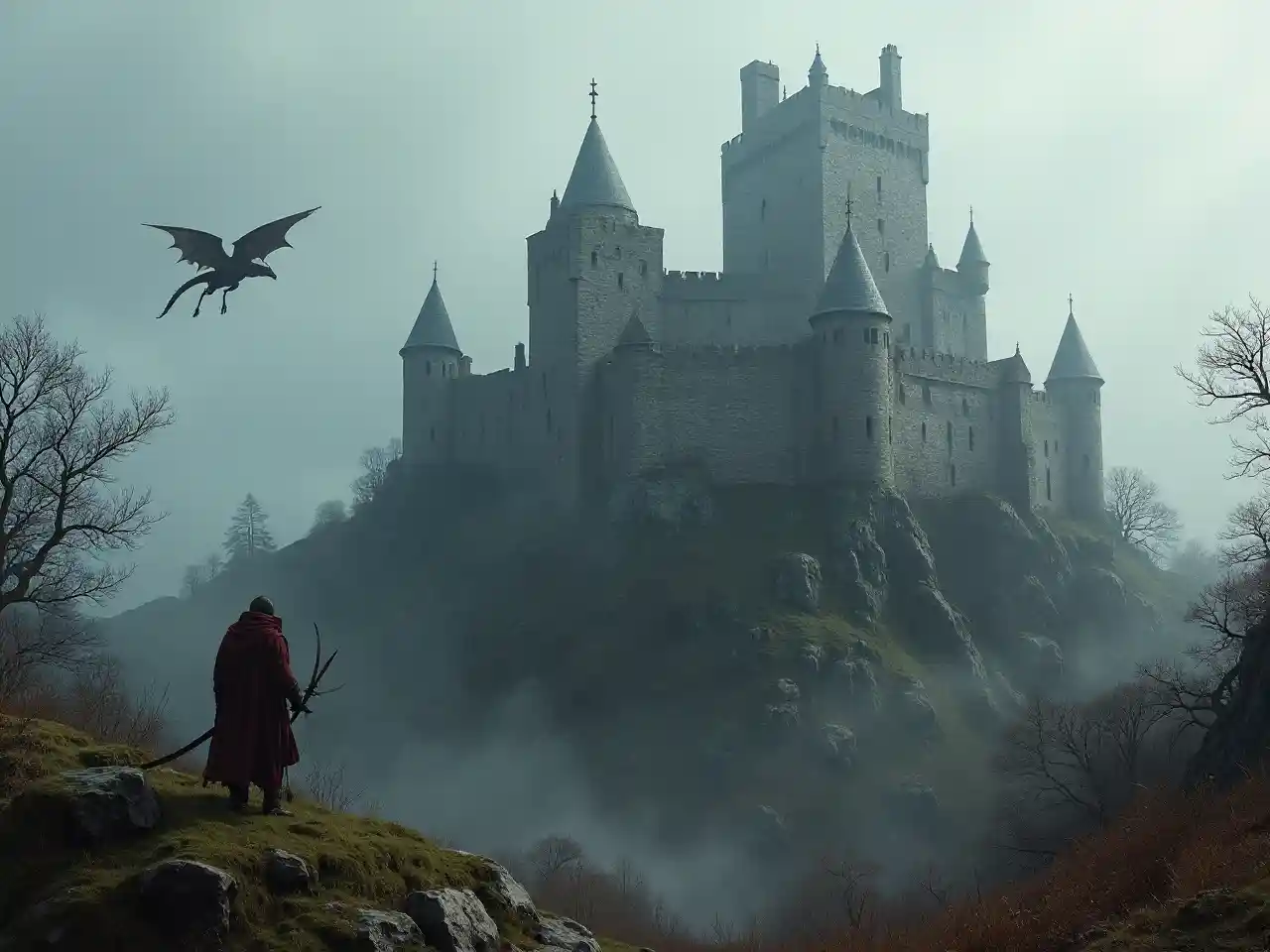 İskoçya'da bir kale. Kuleleri sis kaplıyor. HR Geiger gibi bir tarzla. Ejderha, kaleyi havada çevrelemeli.
