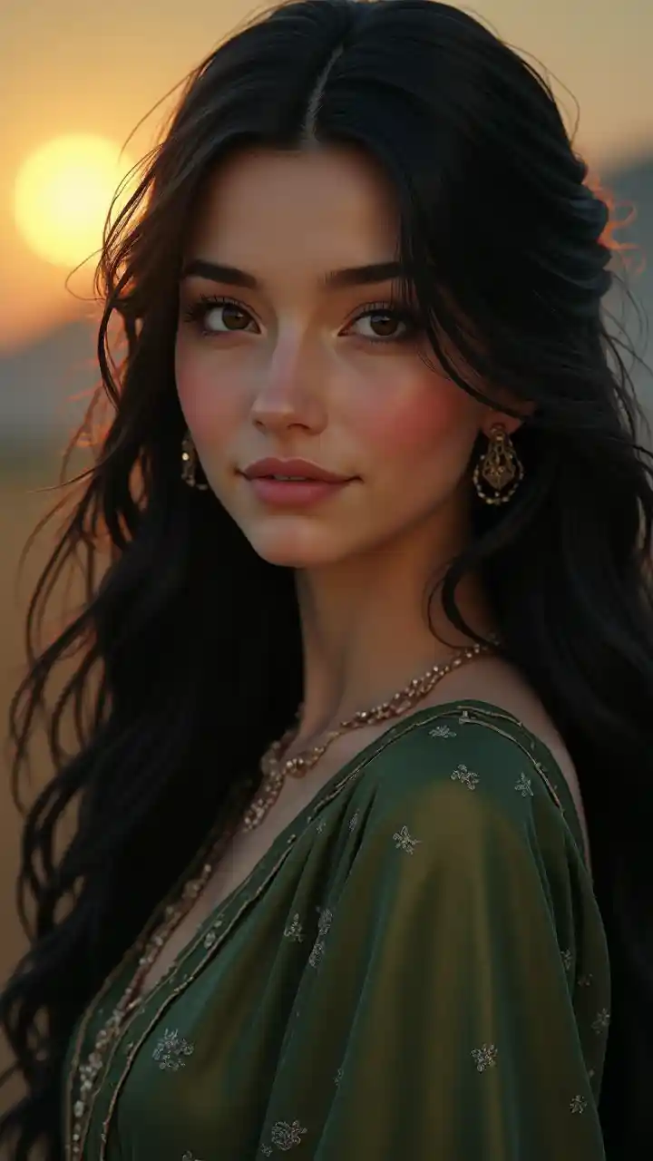 Bu yakın çekimdeki Shahrbanoo, Sassanid prensesi, güzellik ve zariflik bir karışımını yansıtıyor. Uzun, yumuşak koyu siyah saçları omuzlarının etrafında yumuşakça yuvarlanıyor. Shahrbanoo'nun o döneme özgü karmaşık desenlerle zengin bir şekilde süslenmiş olan, kralın statüsünün zarifliğini ve aynı zamanda sakin bir mütevaziliği yansıtıyor. Kumaş Ay ışığında incece parlıyor. (Saçları çerçevelerinde, masumluğu ve gücü de gösteren nazik, utangaç bir gülümseme ortaya çıkar.) Derin, ifadeli, duygulara boğulmuş, sadakatle ve sevdiği kişiler için fedakarlıkta bulunan gözler. Yüzünde yumuşaklık, soylu ve yaklaşılabilirlik arasındaki hassas denge, hem kraliyet figürü hem de merhametli bir varlık olarak karakterinin özünü yakalar.
