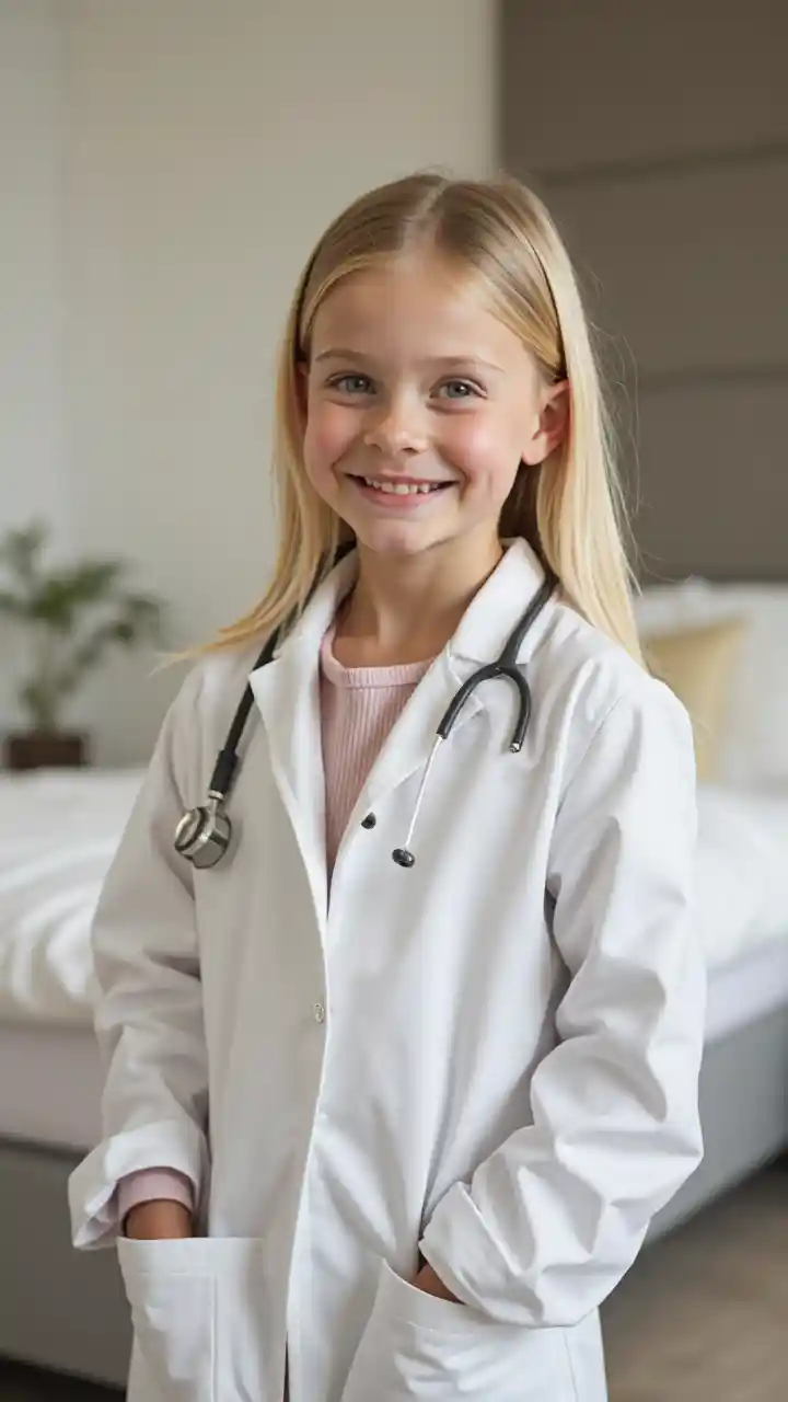 SkylarEvin yatak odasında, beyaz bir doktor paltosu giyen, uyumlu bir gülümseme ile küçük sarışın bir kız. Arkaplanda, yatak odası yastıklı çift yatak içer.