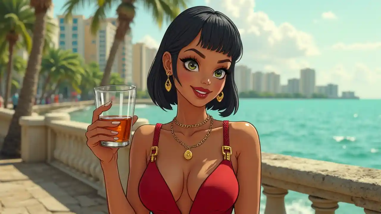 ultra gerçekçi göz kamaştırıcı casus latin kız güzellik, Küba, kırmızı mat sıkı elbise, küçük elbise, kısa saç, düz saç, bob gibi saç, kavisli vücut, geniş çeneler, koyu gözler, koyu saç, bronzluk, koyu kırmızı ruj, altın küpeleri, çizgi film tarzı, dışarıda, okyanus kenarında, arka, altın zincirli dişleri, sıcak ışık, düz ışık, güçlü ışık, taş çitleri tut, gündüz, resmi portre, viski barda, koca altın zincirli elbise, gülümseme, yakın portre, palmiye