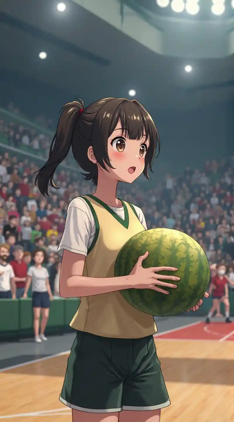 Solo, Japon kız, basketbol sahası, seyirciler, iki eliyle karpuz tutuyor, çok şaşırmış, başyapıt, en kaliteli, güzel