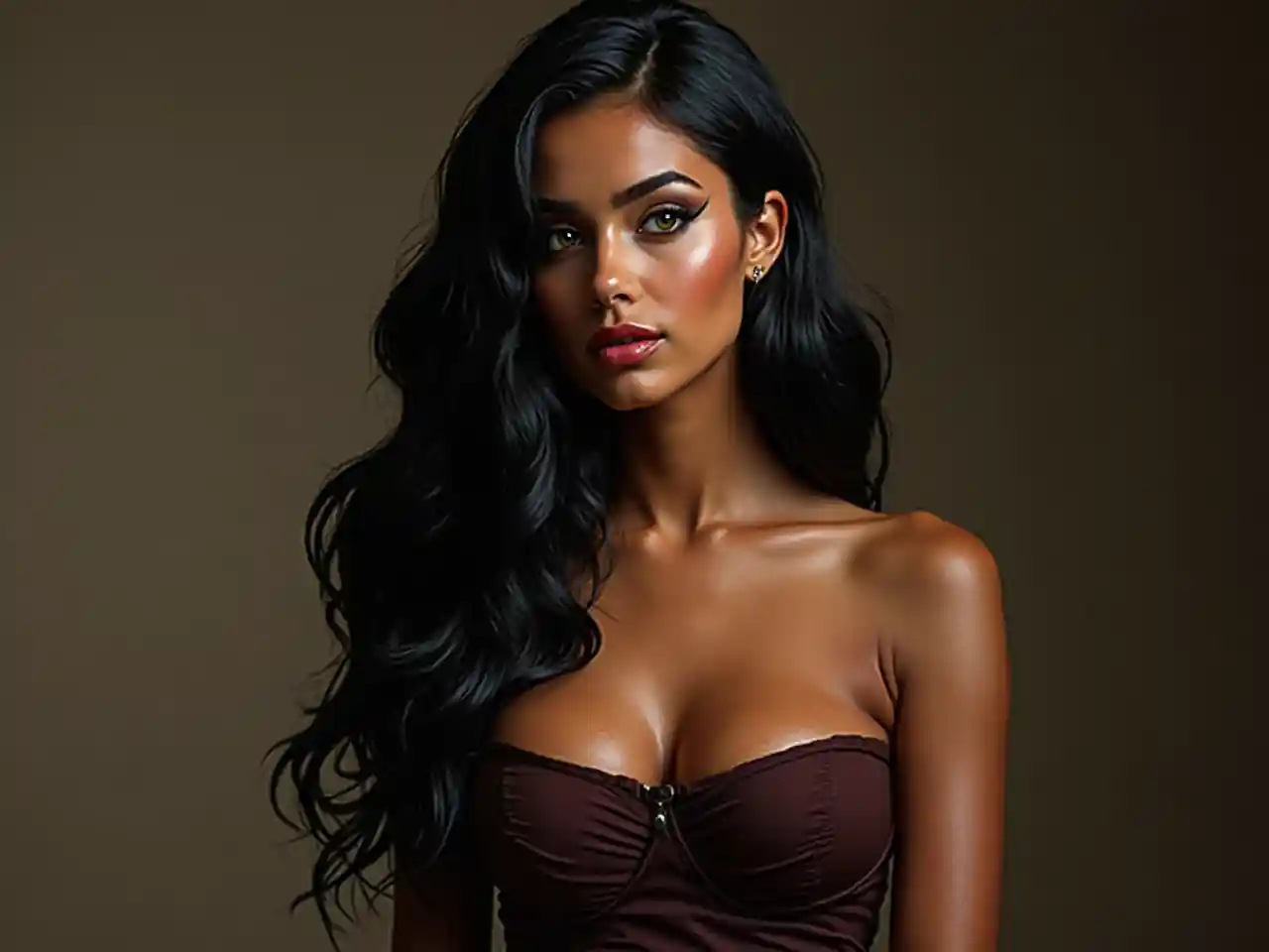Yeşil gözlü, siyah kanatlı göz boyası, tam kırmızı dudakları, çok büyük bir göğüs, ve çok uzun siyah saçları, ve hafif uzanan bir yüzü. Açık, kayışsız bir elbise giyiyor
