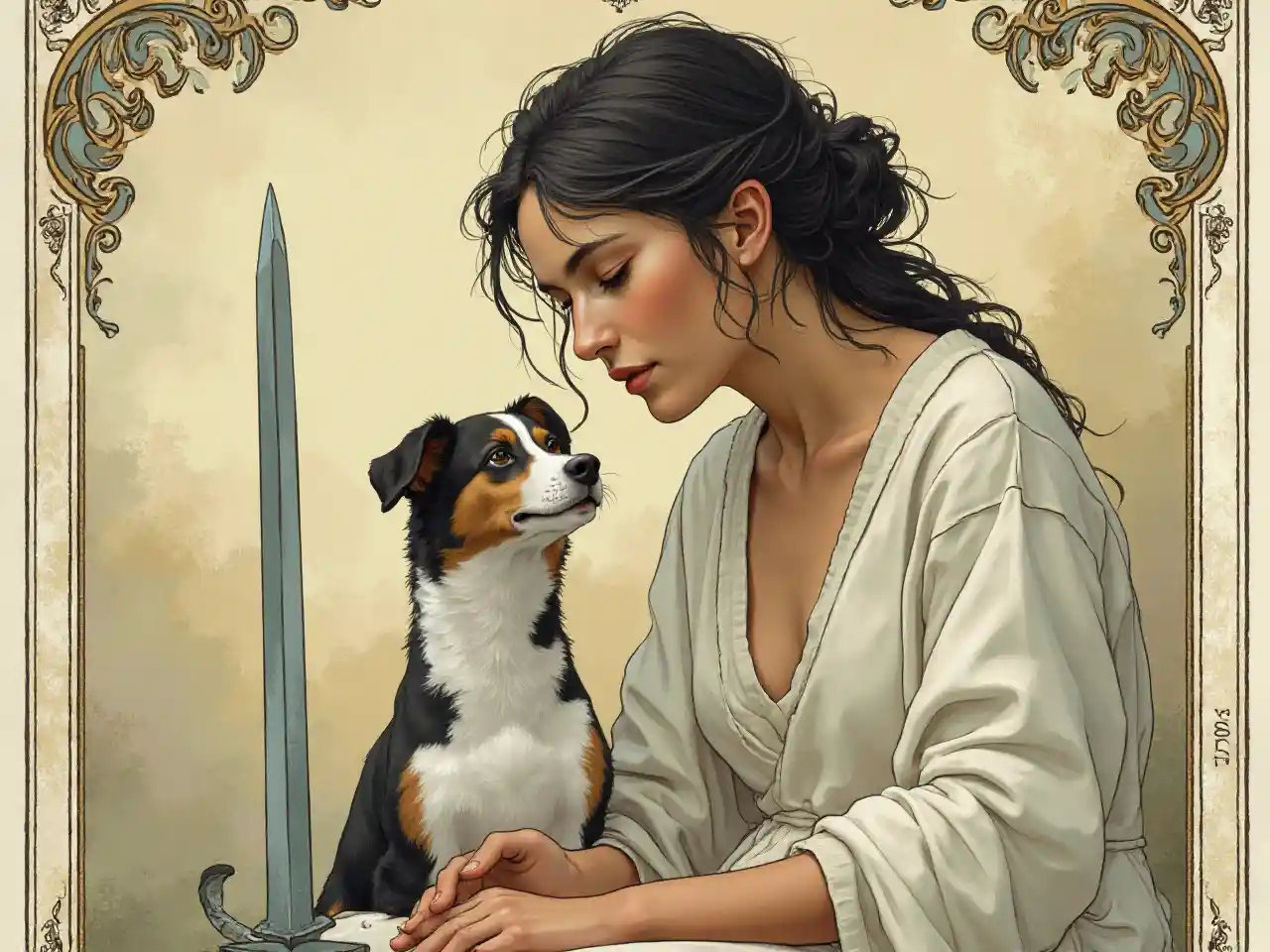 Bir Tarot kartı oluşturun, 08 Kılıç, belki de 30'larının ortasında sakin ve içe dönük bir kişiyi, nazik bir yüz ifadesi, yumuşak kahverengi bir deri ve siyah saçlar, yüzlerini çerçeve eden birkaç gevşek iplik ile süslenmiştir. Sakin bir his ve ince, toprak bir ses yansıtan açık kollu, basit, beyaz, akıcı bir kıyafet giyiyorlar. Gözleri aşağıya doğru eğilmiş, sanki düşünceleriyle kaybolmuş, bir yandan da üzgün. Yanlarında, ilgi dolu ve arkadaşça bir bakışla, adama bakan sadık bir Border Collie var. Sol alt köşede, yatay olarak yatan tek, ince bir kılıç, metal yüzeyinde yumuşak, mavi gri bir ton yansıtıyor. Kartın etrafındaki çerçeve, "Zihin: Güzel bir hizmetçi, tehlikeli bir efendi" alıntısının özünü yansıtan, bir bilgelik, sezginin ve ince bir mistikliğin çağrısında bulunan, hassas, döner desenleri ve ince, sessiz renklerle süslenmiştir.