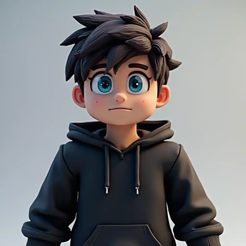Mavi gözlü genç Minecraft karakteri, siyah bir kapüşon giyiyor, piksel sanat tarzı, ön yüz → 3D Minecraft tarzı bir genç çocuğu, siyah kapüşon giyiyor, mavi gözleri, ayakta poz, yüksek kaliteli render, voxel sanat tarzı, gerçekçi aydınlatma