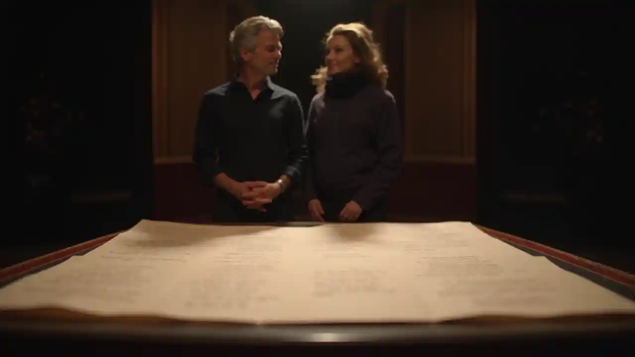 İki orta yaşlı kişiyle, zayıf aydınlatılmış tiyatroda, sahne arkasındaki masanın üzerinde büyük bir kağıt parçası